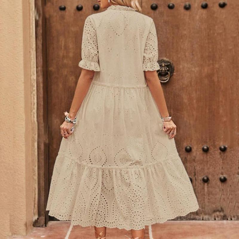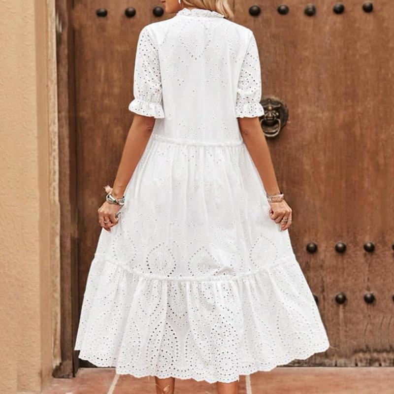 ·Trendy summer dresses for women, featuring exquisite hollow out eyelet embroidered design, v-neck with drawstring, short sleeves with elastic cuffs, a-line silhouette, below the knee length.