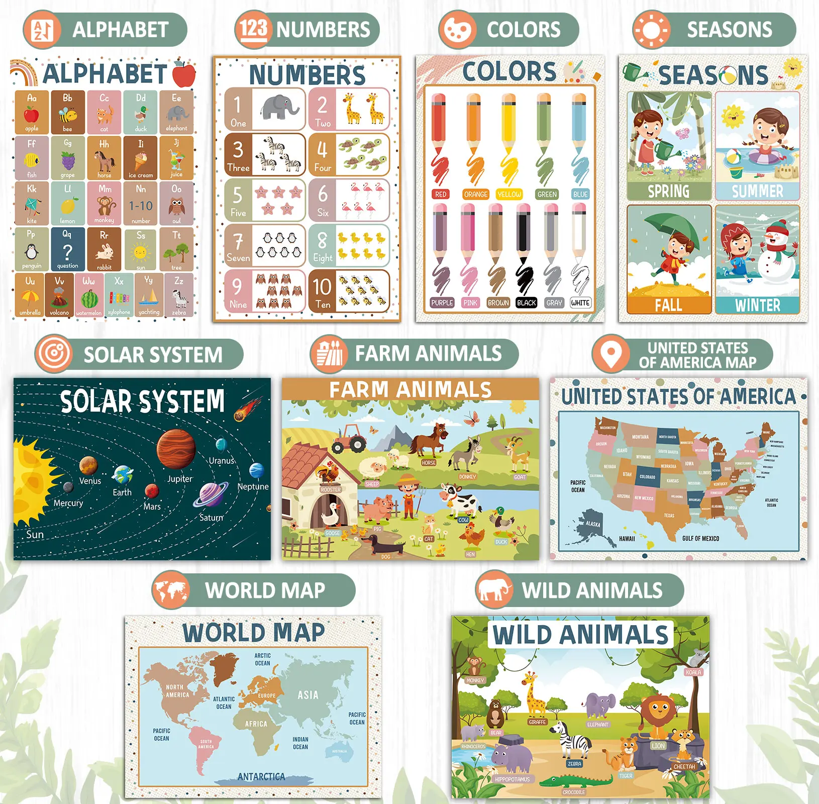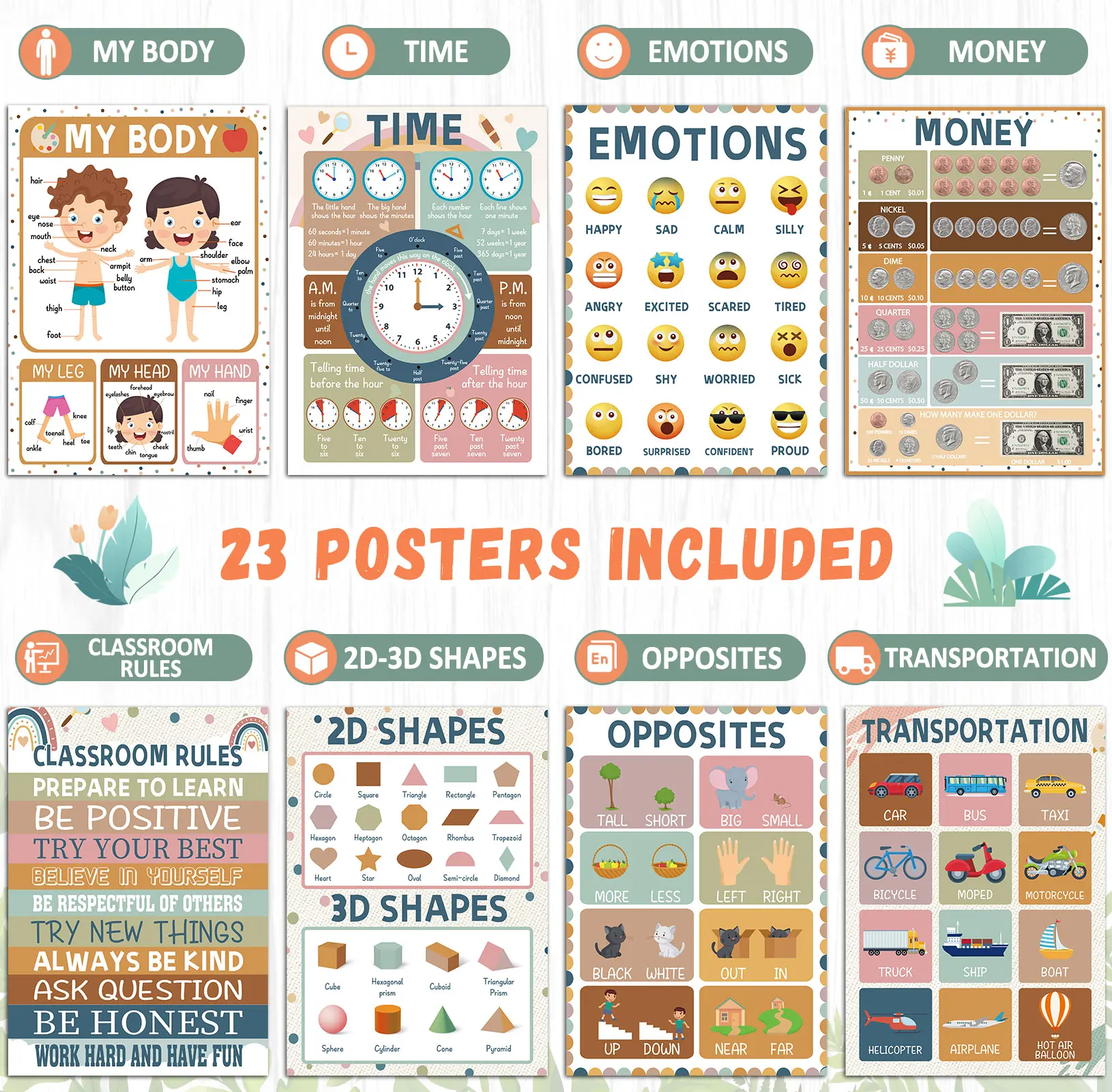 ·Educational posters for toddlers:Educational posters involve learning a lot of knowledge. There are 23 posters in total, including alphabet, colors, 2D-3D shapes, numbers, money, weather, human body, US map, world map and more, making learning fun and interactive.
