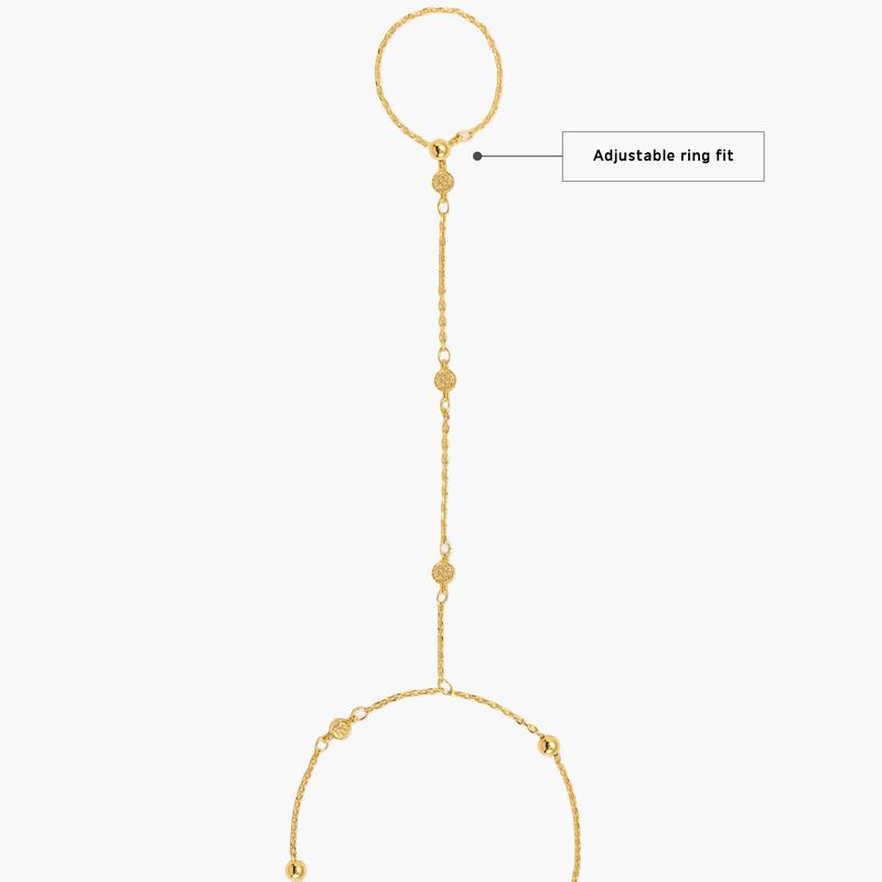 This hand chain bracelet features a delicate gold chain adorned with coin-like accents and polished beads. Designed with an adjustable ring fit for comfort and functuality, this elegant piece connects finger to wrist with a graceful, bohemian touch.
