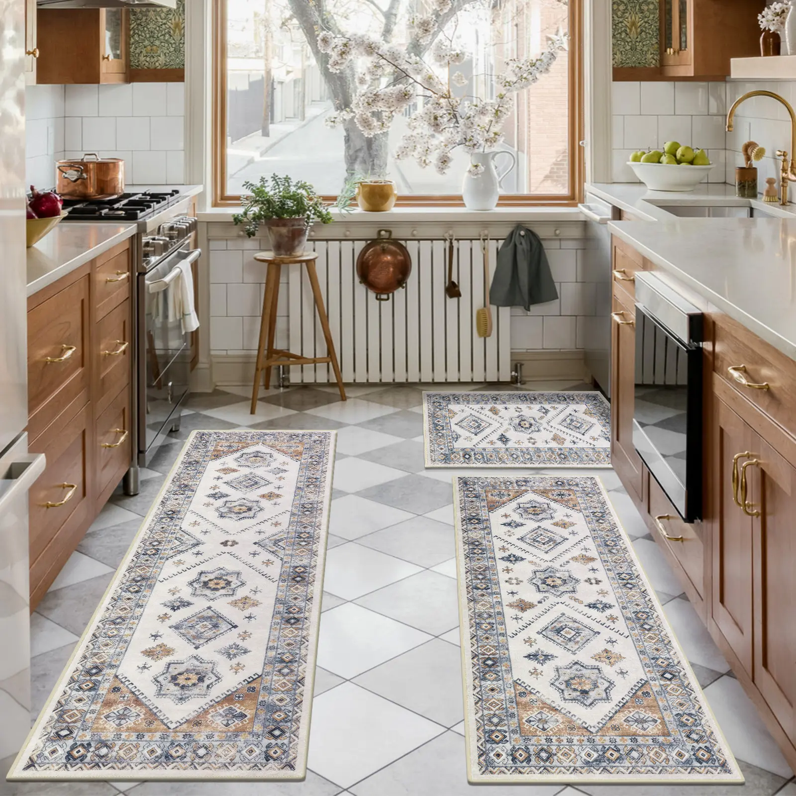 ·Durable & Speical Design Kitchen Mats for Floor: Our kitchen runner rug set made of premium polypropylene fabric material, which is very durable. Design with rich vintage elements and real color, adds an elegant touch in any area of your home. Classic Printing and dyeing process, non-fading and non-shrink, protect your kitchen floor dry and clean from moisture and stain.