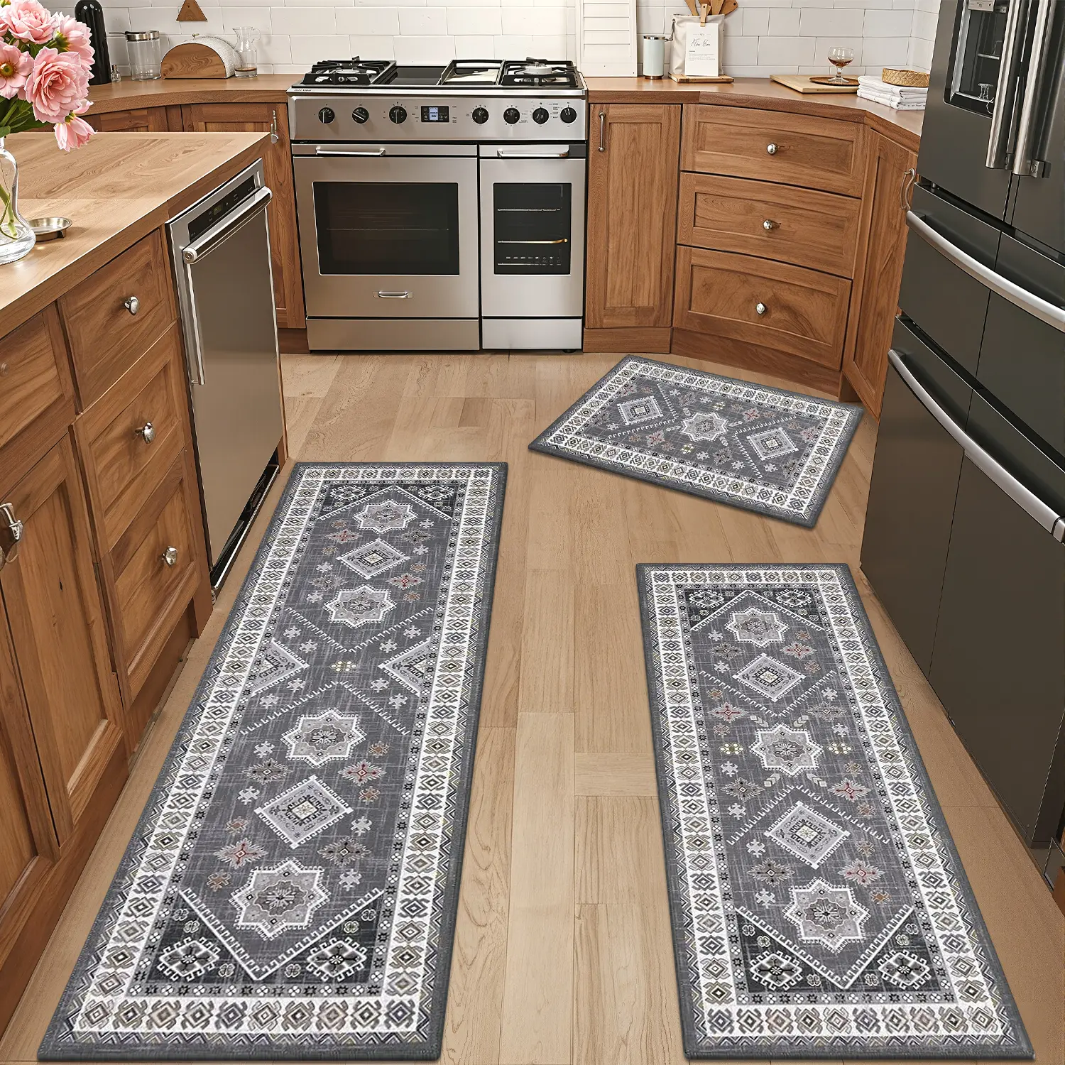 ·No Slip Kitchen Mat Rug Set with Runner: The boho kitchen floor mat set made of high-quality polyester, and come with premium TPR and cotton non skid backing, durable, reliable and practical, which make this kitchen runner rugs set can be effective to avoid slipping and scratching the floor, keep your home clean and dry.