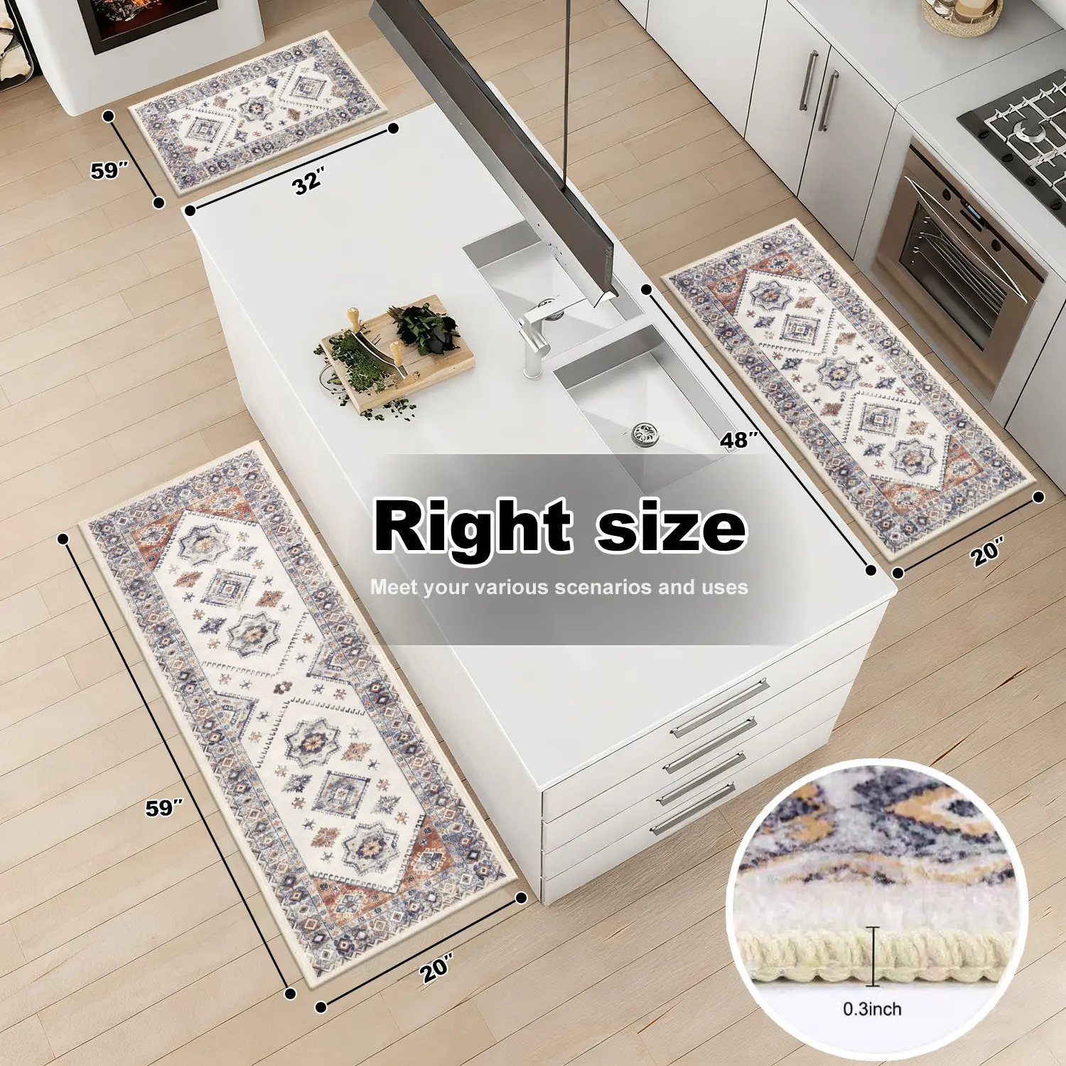 ·Kitchen Rugs Sets 3 Piece with Runner: This farmhouse kitchen rugs set include 3 piece kitchen floor mat which measures 20x32inch+20x48inch+20x59inch and 0.3inch thickness. Perfect combination size, you can arrange them at will in any home, office or holiday decoration.