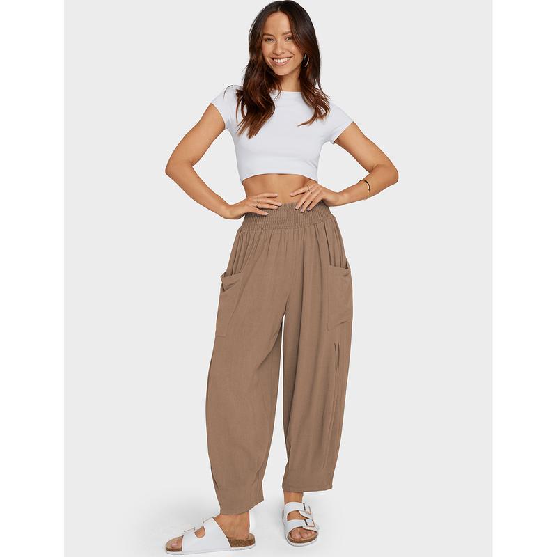 Breathable 30% linen and 70% rayon blend makes these high-waisted wide-leg pants soft, cool, and comfortable all day. The relaxed fit features dropped side pockets for a casual, laid-back look.
