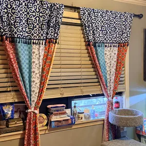 These bohemian style curtains will brighten your home and your mood. The patchwork style columns of colorful floral and geometric patterns are printed on fabric that allows natural light into the room. Tassels run across the top portion of each panel. This set adds bright color and energy to your room. The stunning colors really pop in this design.