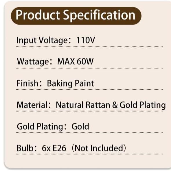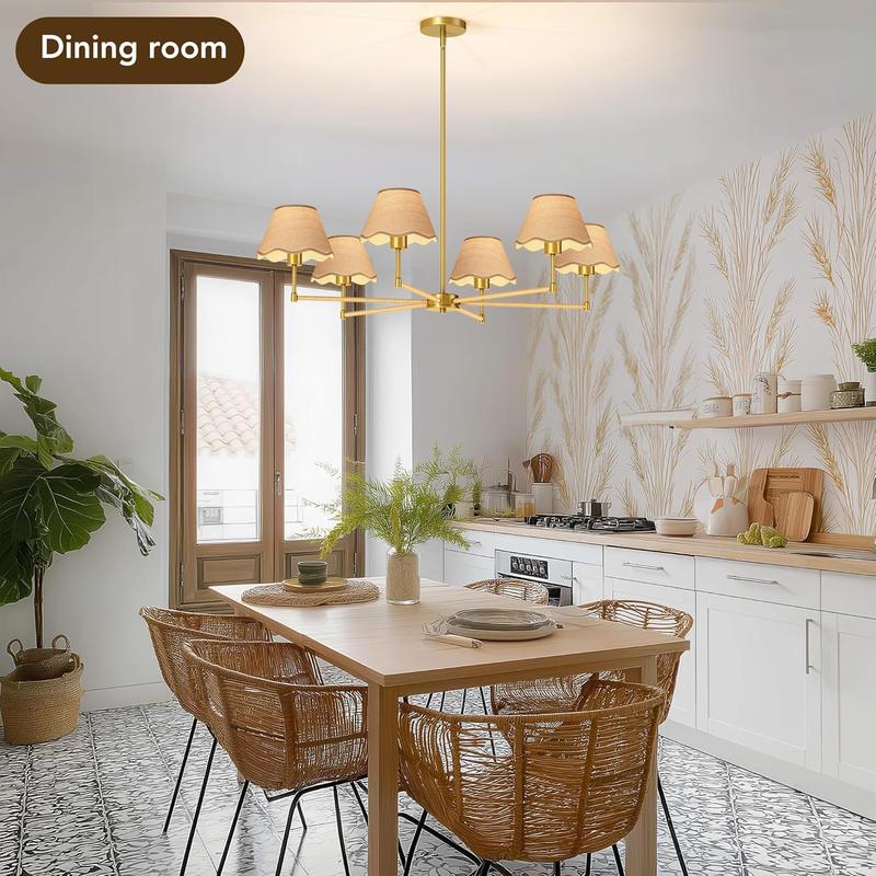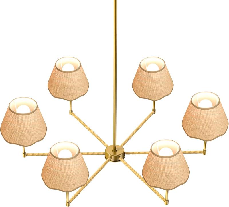 5. Boho Rattan Chandelier, Rattan Pendant Light, 6-Light Modern Farmhouse Industrial Chandelier with Gold Lampshde, 36” Large Pendant Lighting Fixtures with E26 Base, for Kitchen Island Dining Room