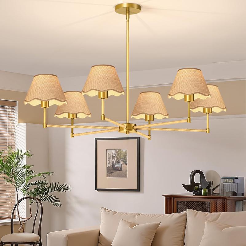Boho Rattan Chandelier, Rattan Pendant Light, 6-Light Modern Farmhouse Industrial Chandelier with Gold Lampshde, 36” Large Pendant Lighting Fixtures with E26 Base, for Kitchen Island Dining Room