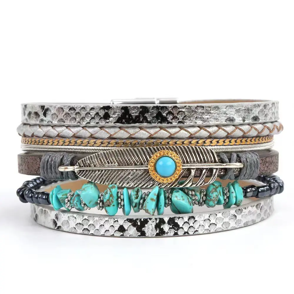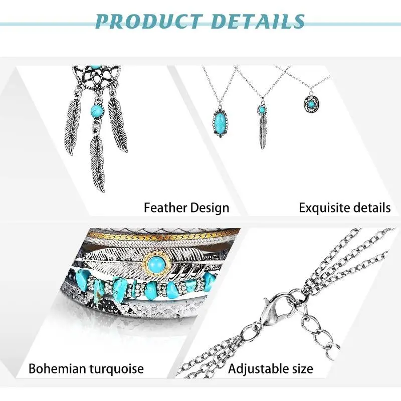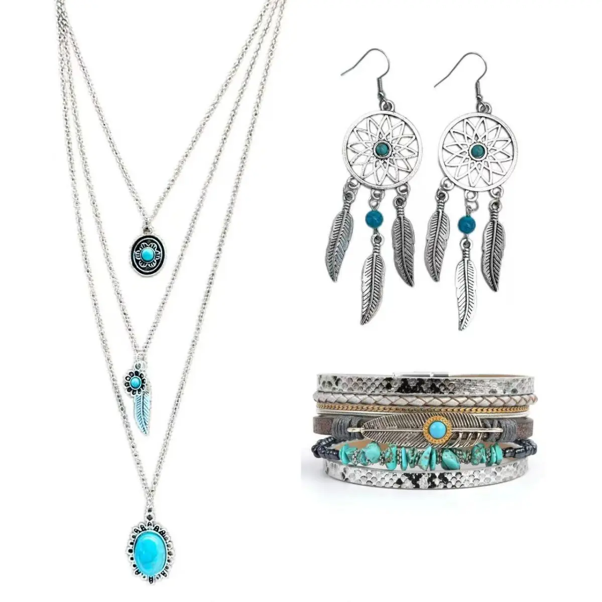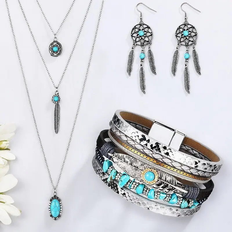 ·Complete Jewelry SetThe set consists of a pendant necklace, dangle earrings, and a bracelet. All pieces are designed in a bohemian western style with turquoise accents.