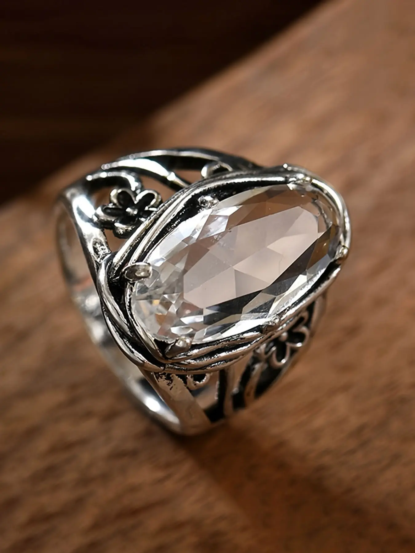 Boho Style Women's Ring, Vintage Ethnic Oval Zircon Hollow Flower Design, Versatile Party Jewelry, Unique Personalized Accessory, Boho Style Rings