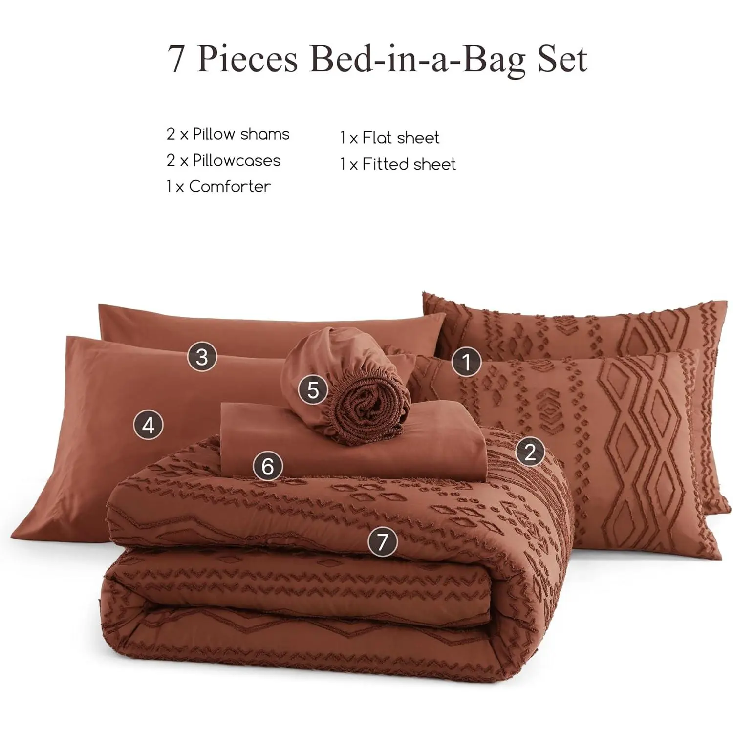 Package & Size: Full comforter set includes 7 pieces (inch): 1 comforter 80"x90", 1 flat sheet 81"x96", 1 fitted sheet 54"x75"+14", 2 shams 20"x26", 2 pillow cases 20"x30".