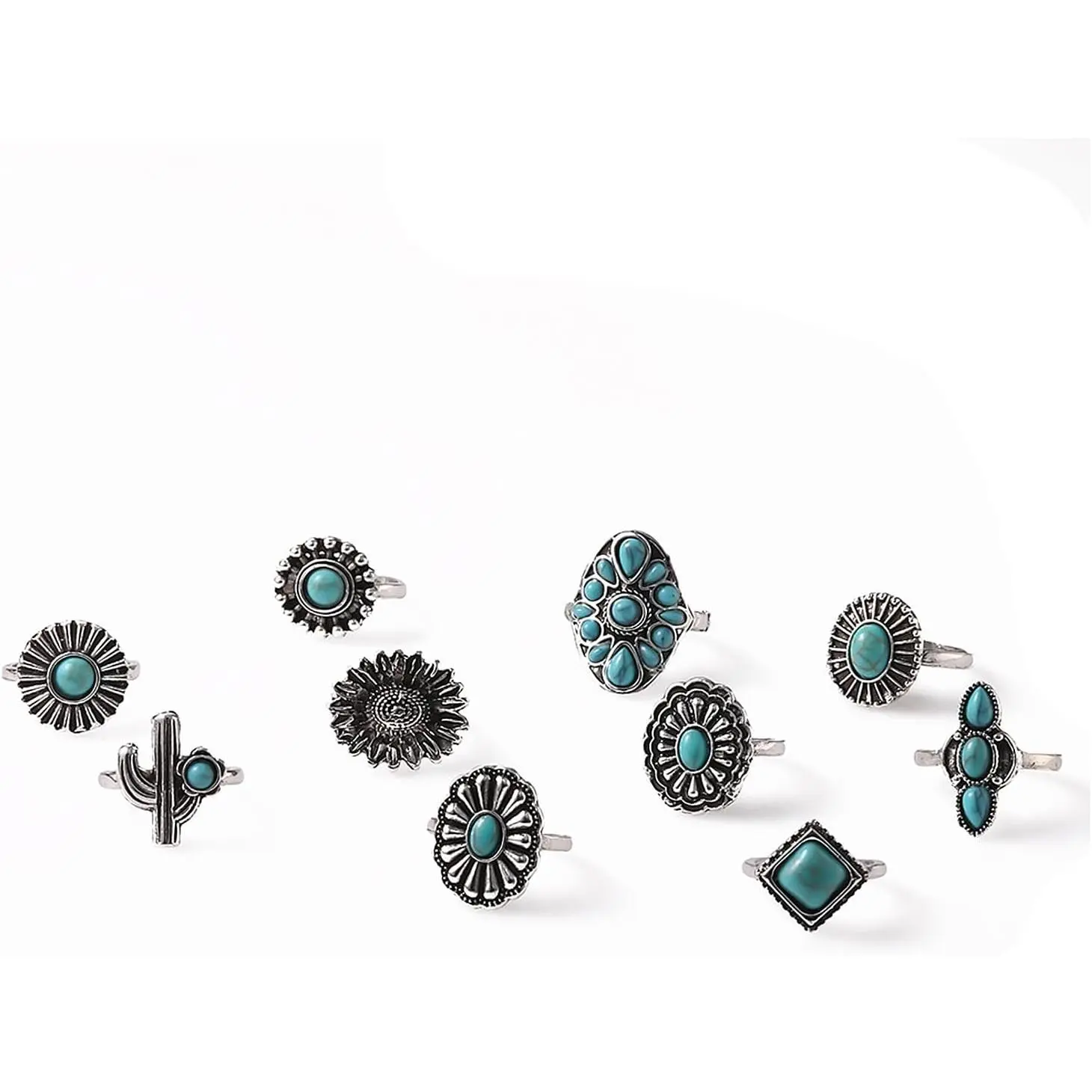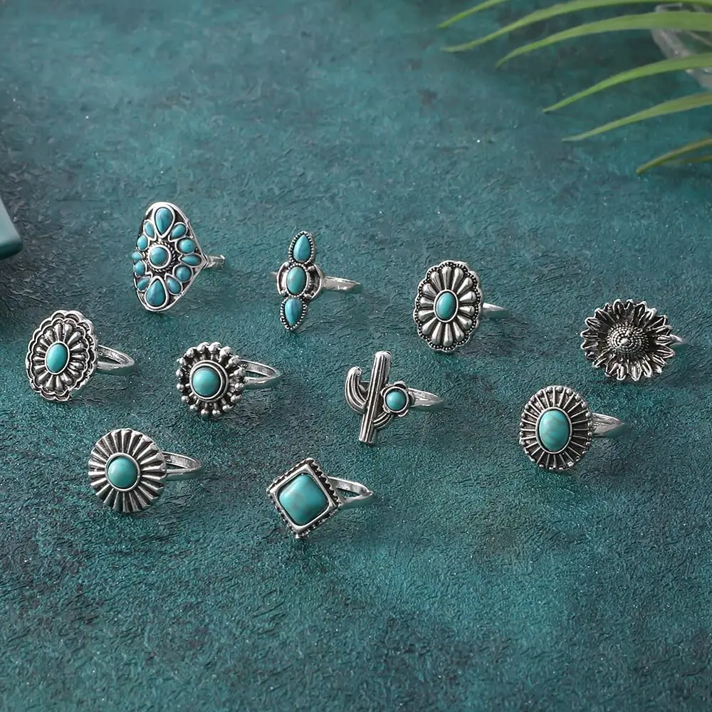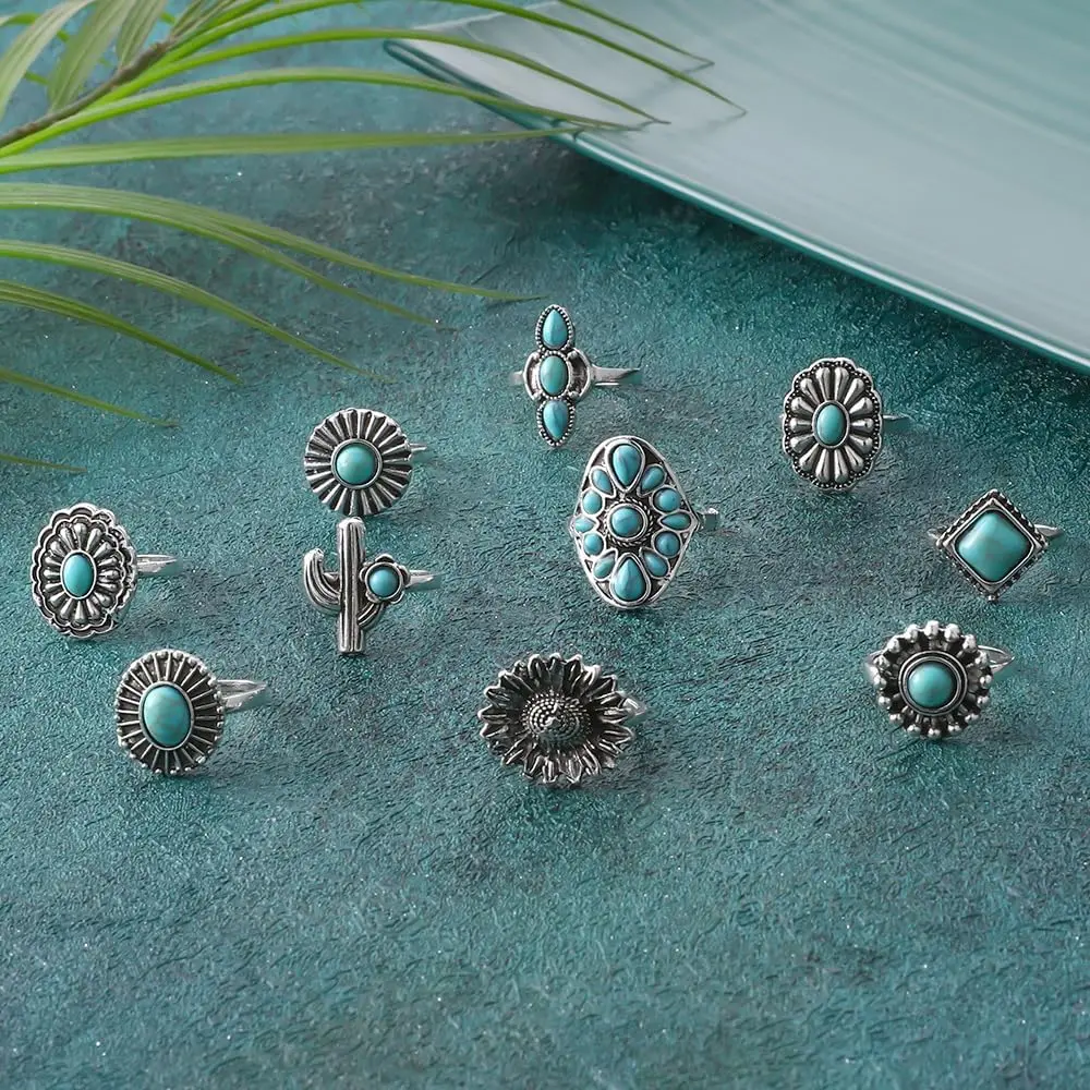Boho Turquoise Ring for Women Silver Western Stackable Knuckle Rings Vintage Cactus Flower Midi Finger Ring Statement Jewelry Gifts