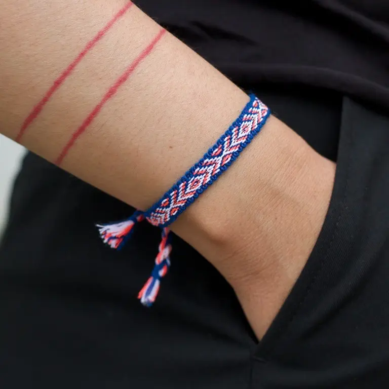• Woven slim bracelet, that lays flat on your wrist and is secured by the tie-on ties.