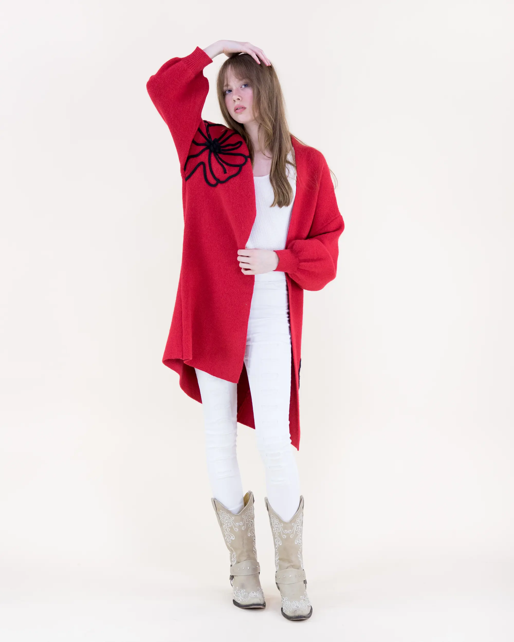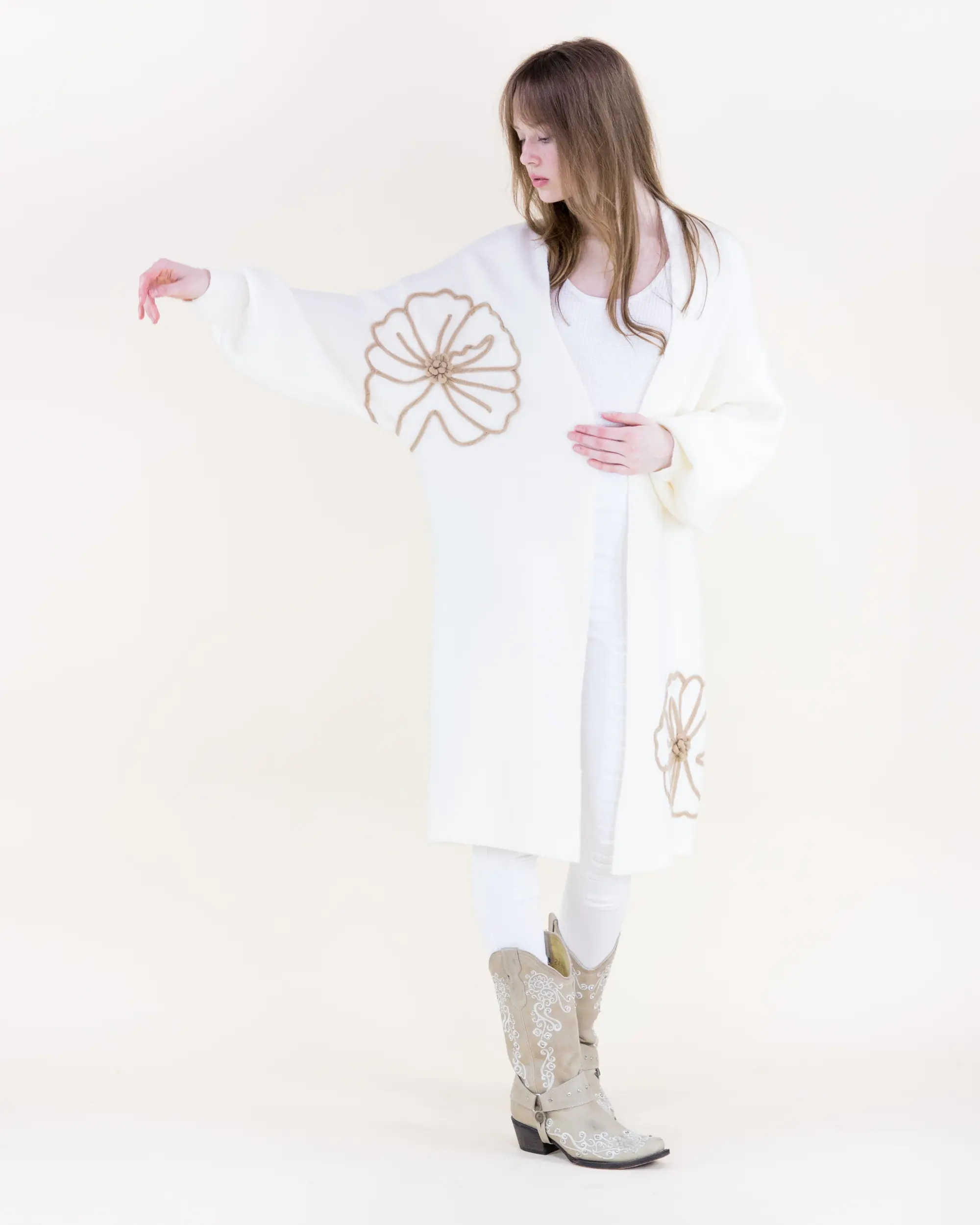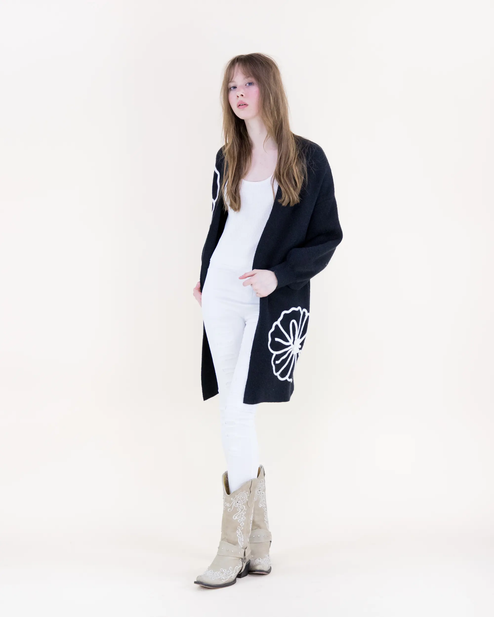 This cardigan is a chic layering piece that combines bold floral artistry with everyday comfort. Featuring oversized floral outline accents, it adds a modern graphic touch to a classic open-front silhouette. Crafted from a premium knit blend of 55% viscose, 22% nylon, and 23% acrylic, it offers softness, breathability, and durability. The relaxed fit and long sleeves make it perfect for layering across all seasons, while its bold embellishment creates a standout look.