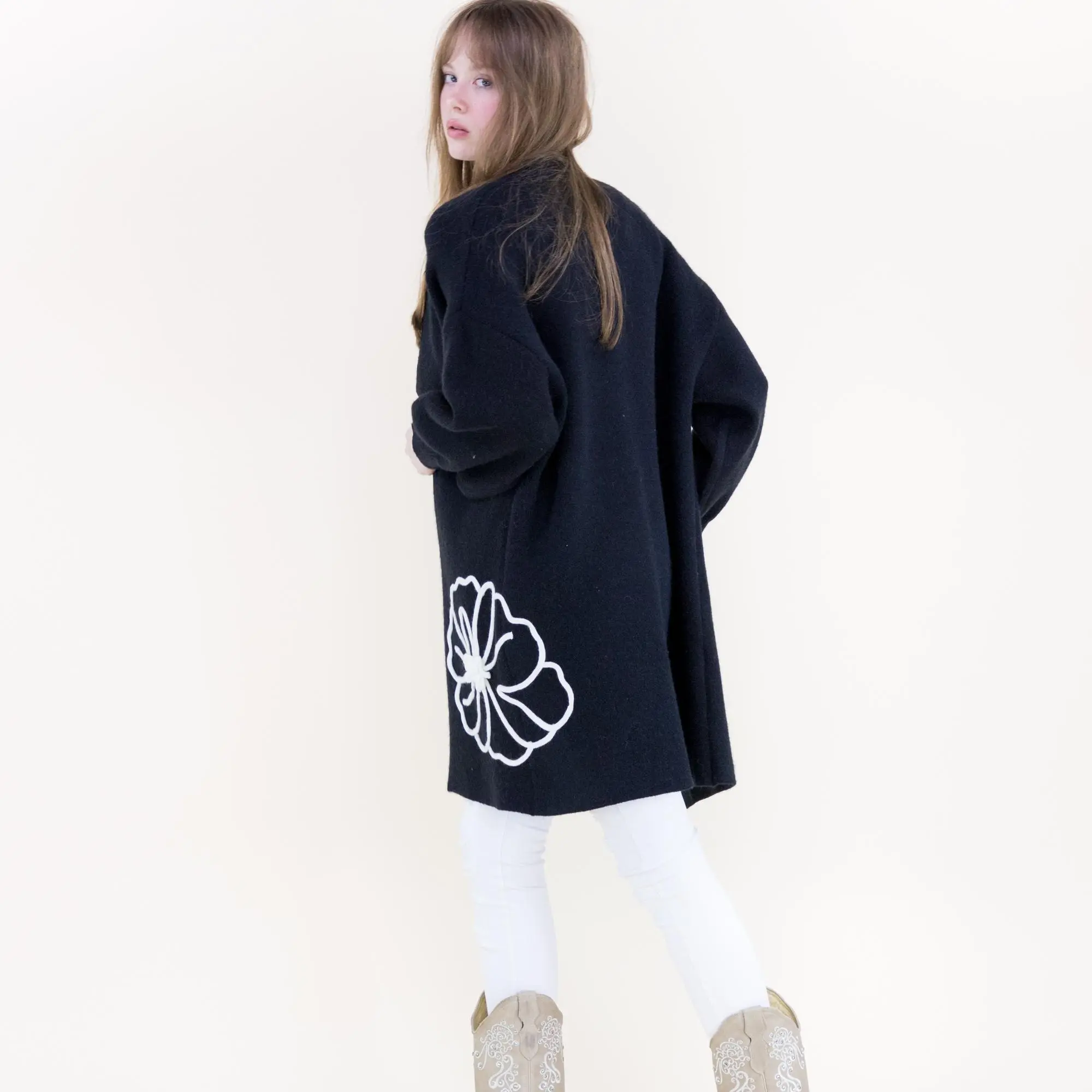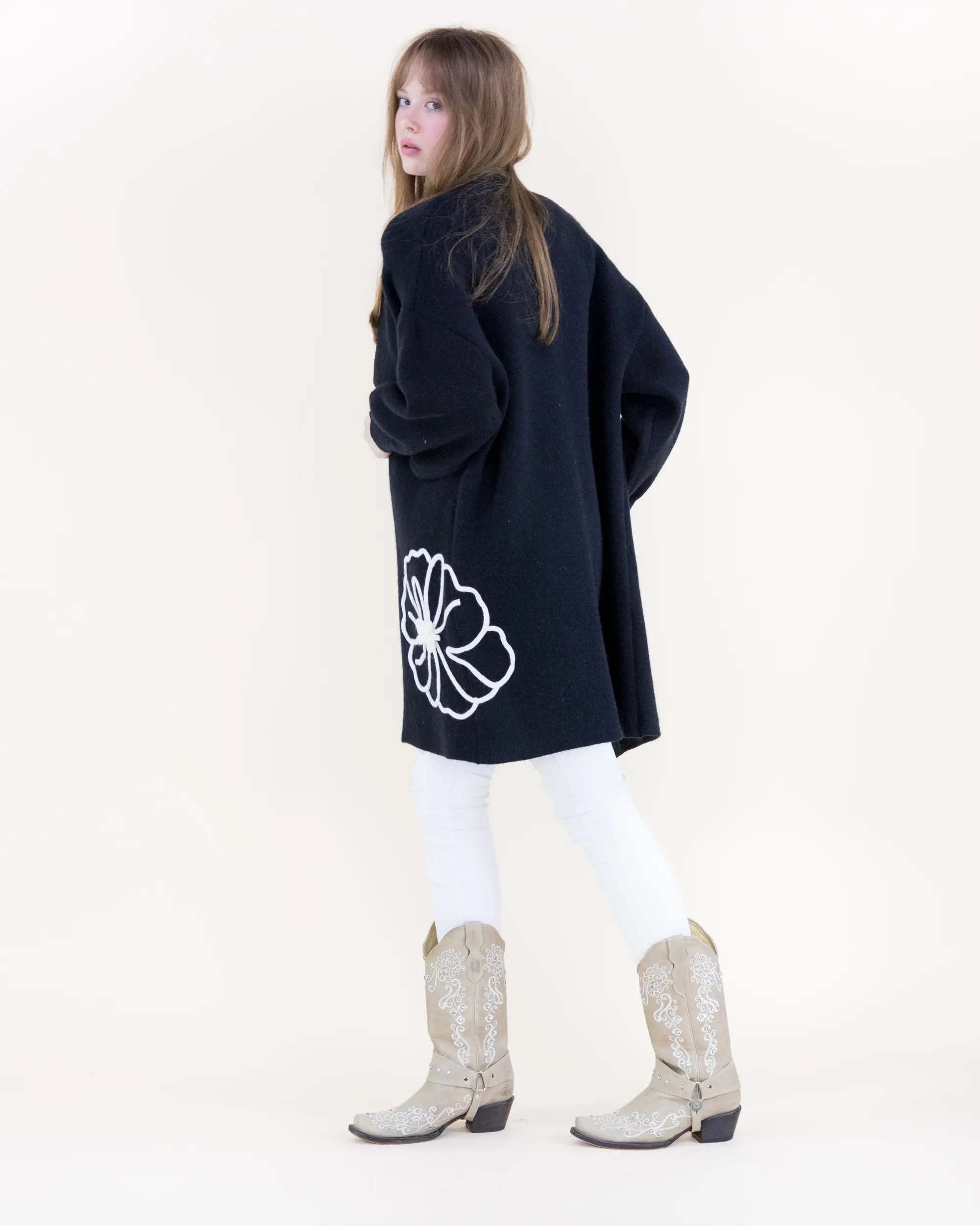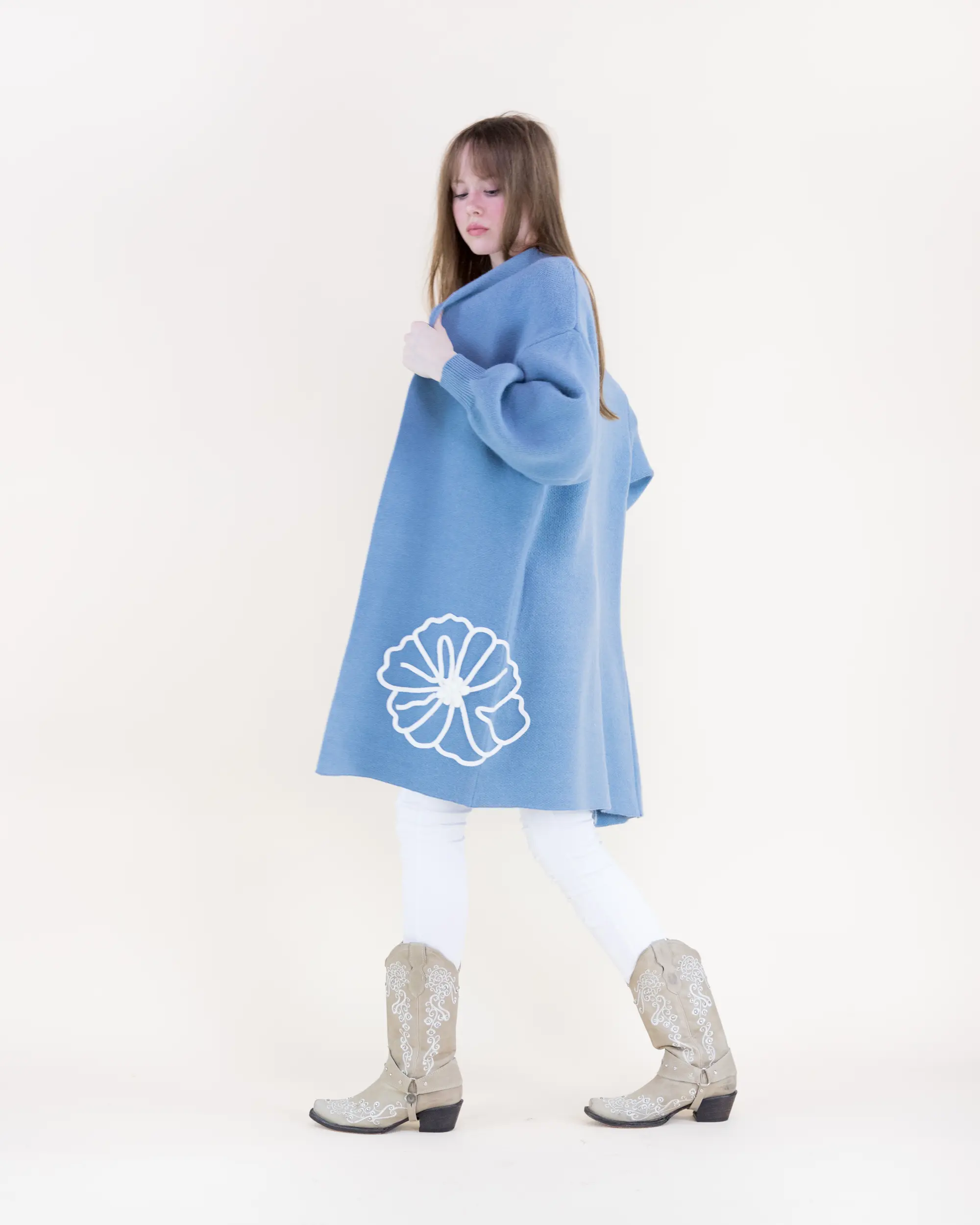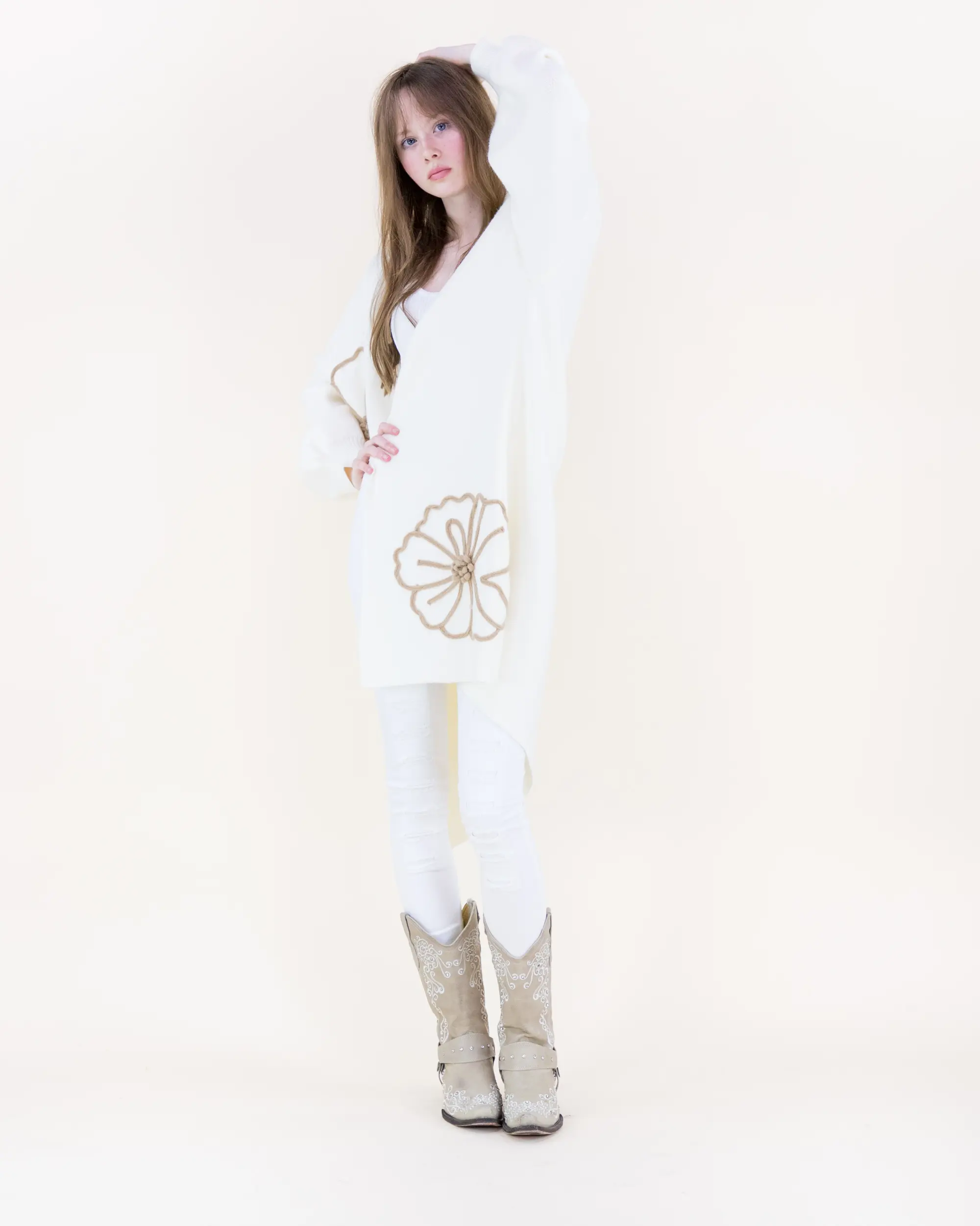 This cardigan is a chic layering piece that combines bold floral artistry with everyday comfort. Featuring oversized floral outline accents, it adds a modern graphic touch to a classic open-front silhouette. Crafted from a premium knit blend of 55% viscose, 22% nylon, and 23% acrylic, it offers softness, breathability, and durability. The relaxed fit and long sleeves make it perfect for layering across all seasons, while its bold embellishment creates a standout look.