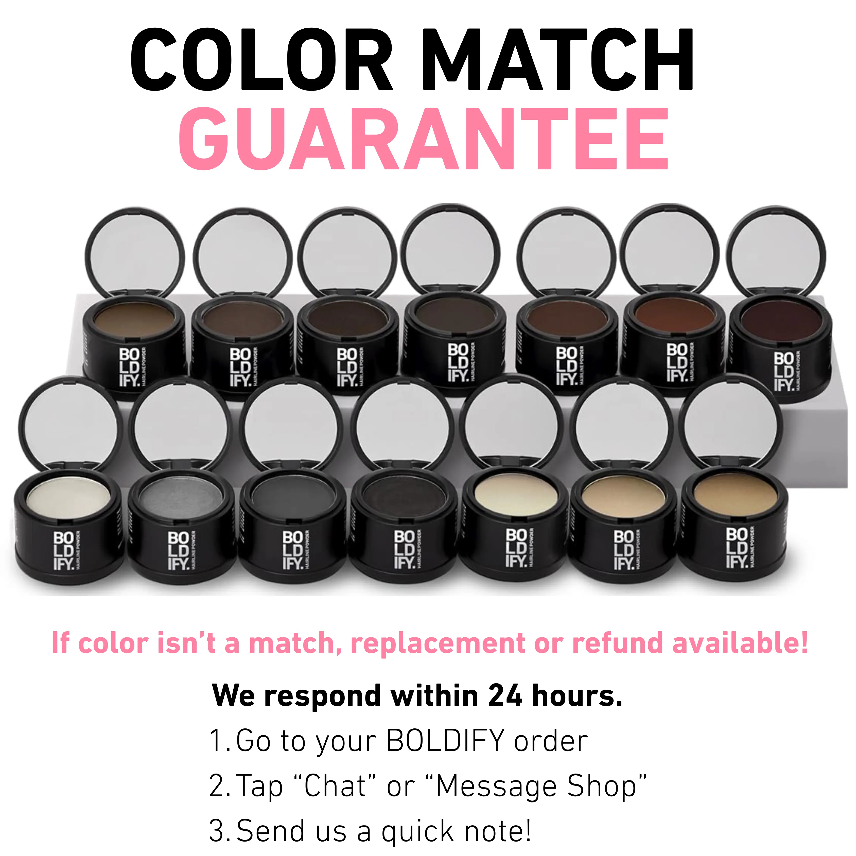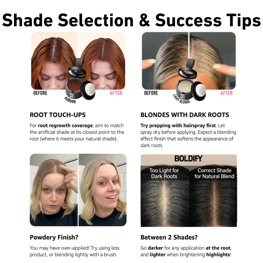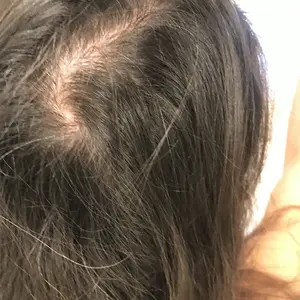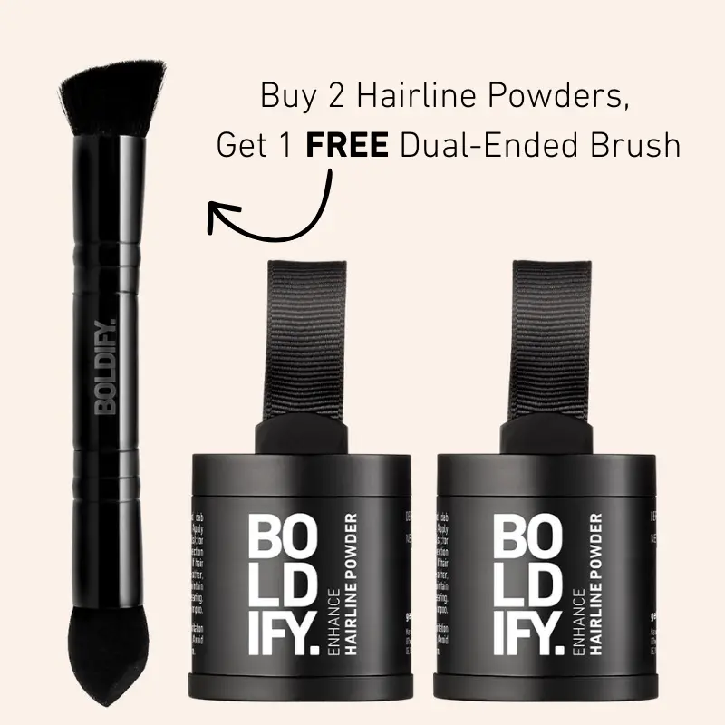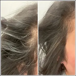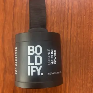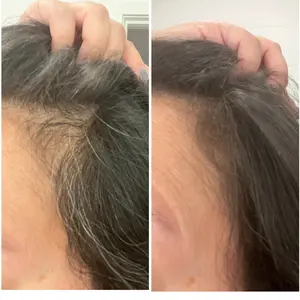 I have lost allot of hair due to weight loss and have many bald spots but thanks to Boldify Dark Brown hairline powder my hair looks thicker & fuller. I do have extensions in for length but the powder covers up the baldness. When I get out of the shower & blow dry my hair putting on the powder is just part of my routine. Iâve attached a pic of one of my bald spots and then when my hair is done up. Thank you Boldify!