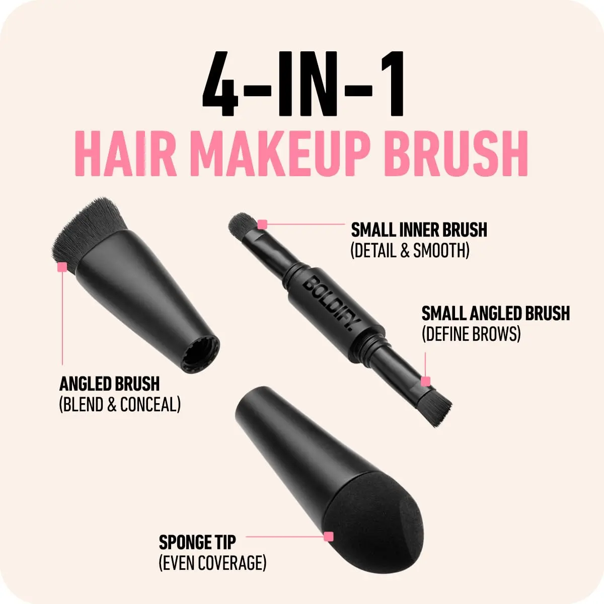 ·HIGH QUALITY PERFORMANCE Experience flawless application with Boldify's 4-in-1 brush: 1. Sponge tip for even coverage and precise application. 2. Angled brush for effortless blending along the hairline and beards for a natural, seamless finish. 3. Inner brush for smooth, detailed blending with a polished look. 4. Small angled brush for defining brows with precision. Easily switch between tools with the smart screw-apart design, making styling a breeze.