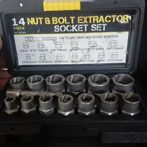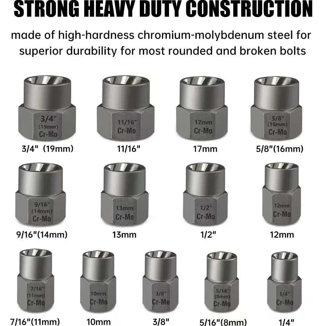 This Bolt Extractor Kit includes 13 pieces, perfect for removing stripped bolts and nuts. Ideal for use with a drill, it handles rusted and frozen bolts effortlessly. The set includes an impact bolt nut remover for added convenience. ️