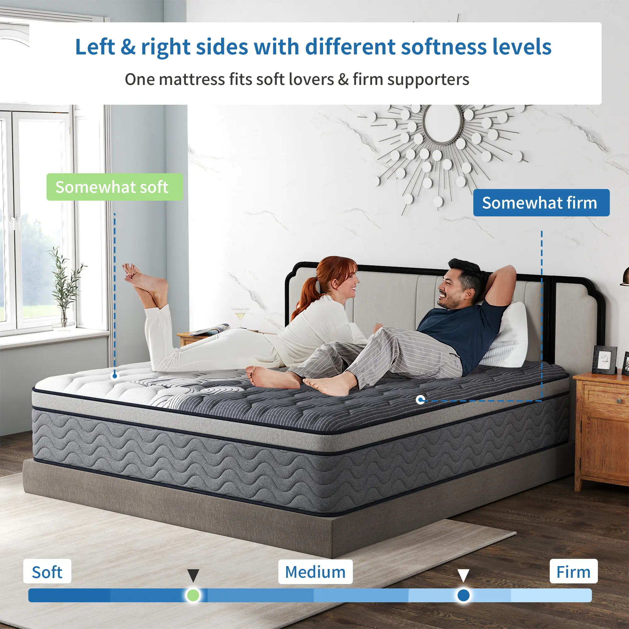 Dual firmness design with color-coded comfort. Gray area (medium-firm 7‑8) delivers strong support; white area (soft 3‑4) provides gentle cushioning. One mattress perfectly meets different sleep needs for couples, family members, and guests.