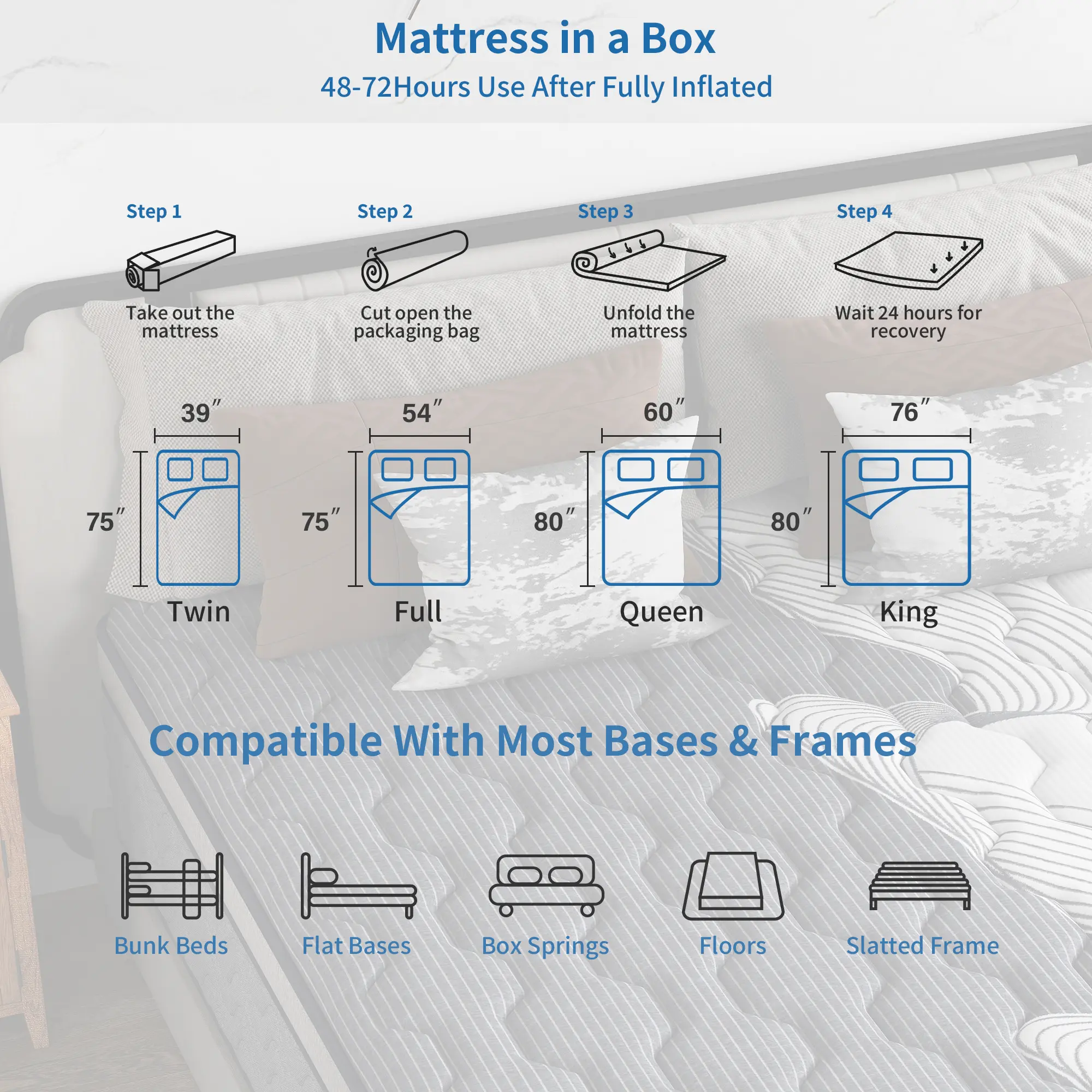 ·Queen: 80"L x 60"W x 12"T / 80 lb