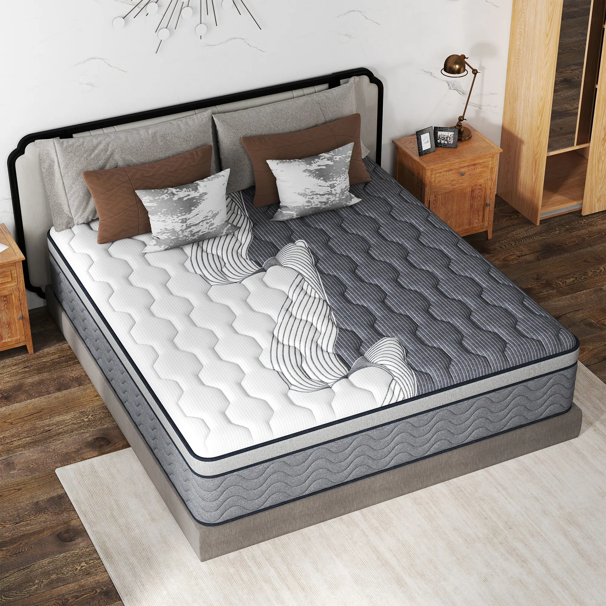 Premium spring & memory foam structure balances reliable support and luxurious softness. Great resilience keeps the mattress in great shape without sinking over time. Breathable surface prevents overheating for cool, comfortable all‑night sleep.