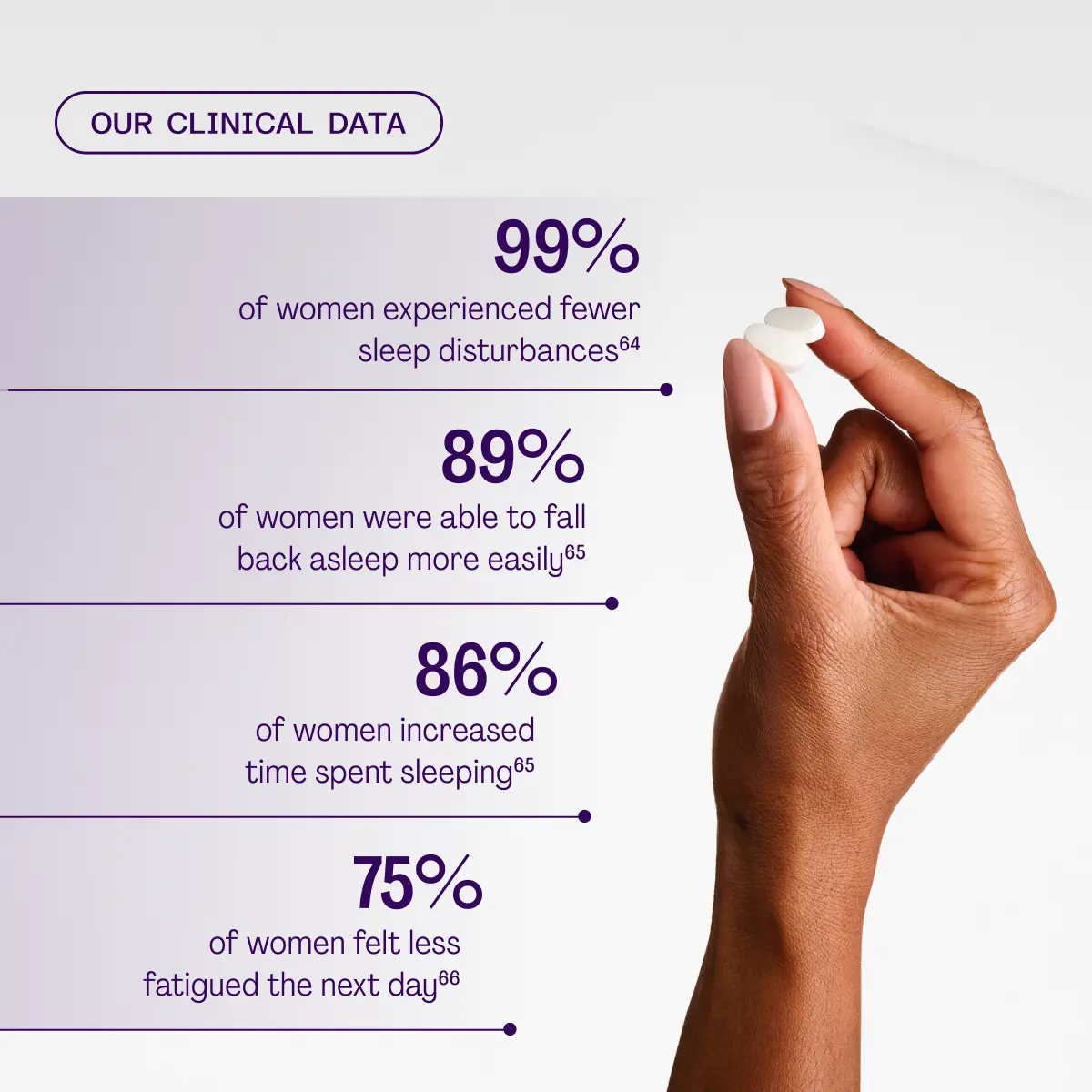 ⁶⁵ Carbonneau et al. Sleep. 2025;48(Supplement_1):A402-A403. A randomized, double-blind, placebo-controlled clinical study with 127 women. Full data on file.
