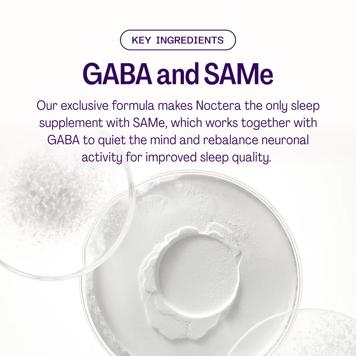 Noctera is a hormone-free, non-sedative sleep supplement with a continuous-release, non-groggy formula. It combines GABA, L-theanine, magnesium glycinate, and SAMe—each carefully selected to help rebalance hormonal signals that disrupt sleep patterns and to calm the mind for a better night's rest.