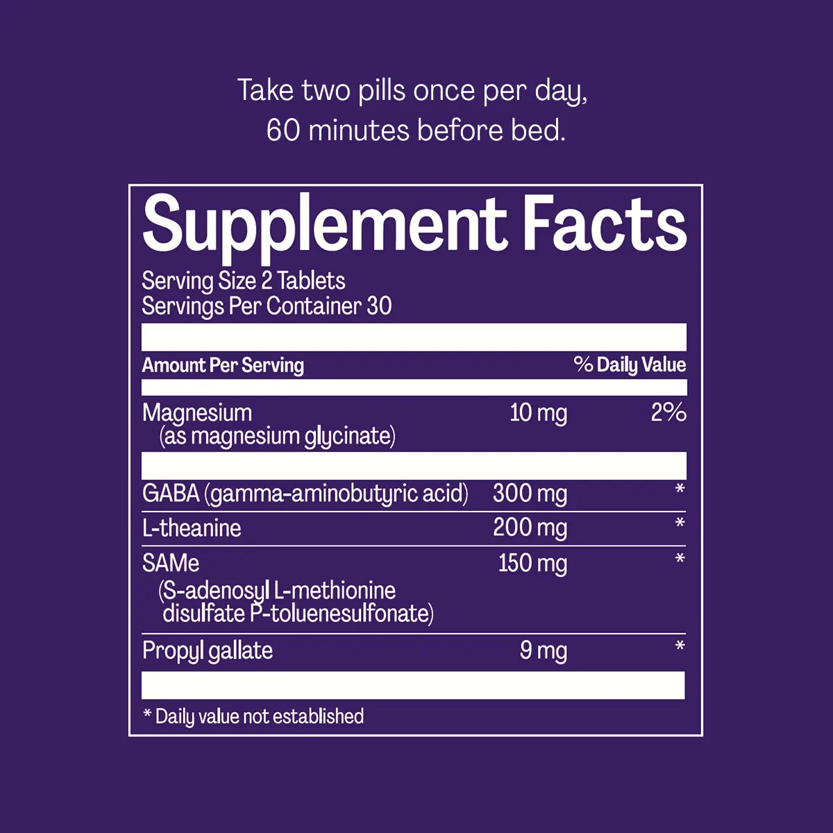 Magnesium (as magnesium glycinate), GABA (gamma-aminobutryic acid), SAMe (S-adenosyl L-methionine disulfate P-toluenesulfonate), l-theanine, propyl gallate.