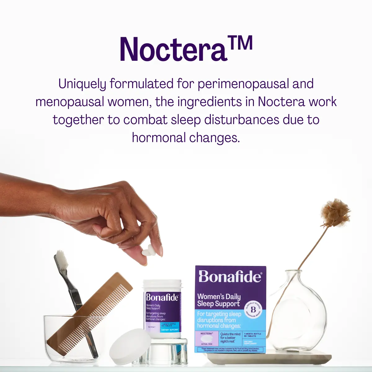 A daily supplement designed to combat sleep disruptions caused by hormonal changes, Noctera balances your body’s natural sleep signals to improve quality of sleep, reduce sleep disturbances, and increase daytime energy.*