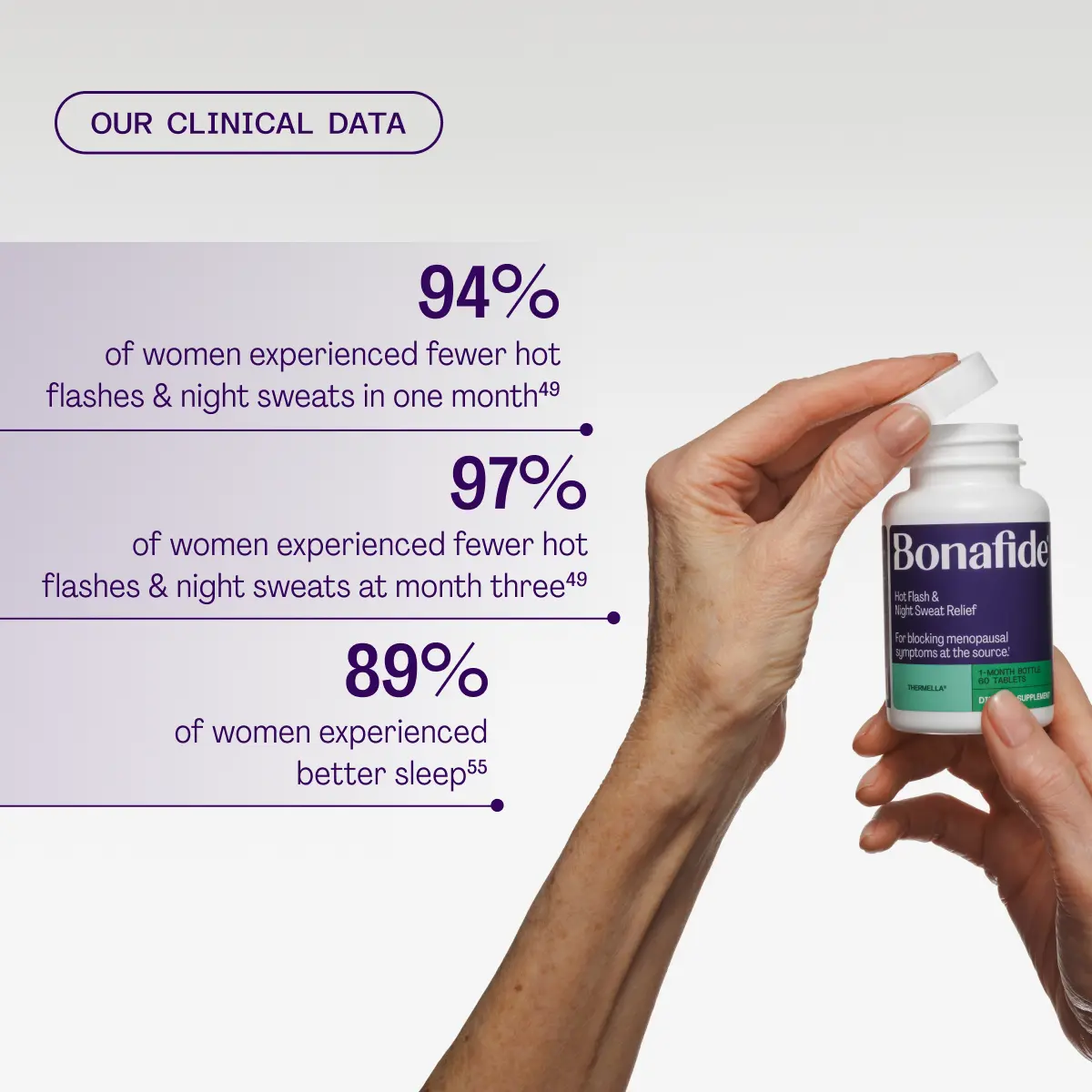 In clinical trials, Thermella starts reducing hot flashes and night sweats as early as two weeks. Relief improves with consistent use, with best results at month three.⁴⁹ ⁵⁰