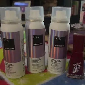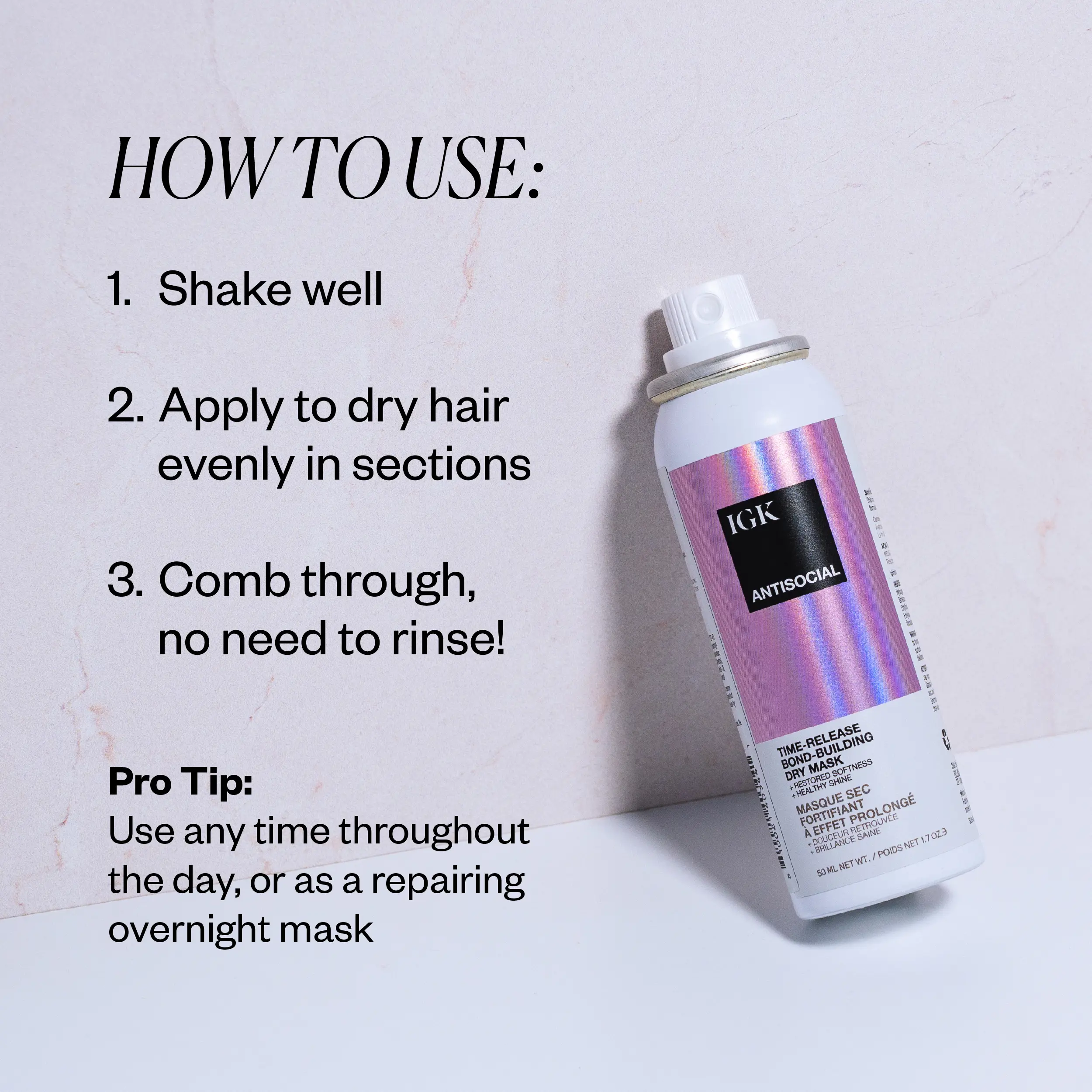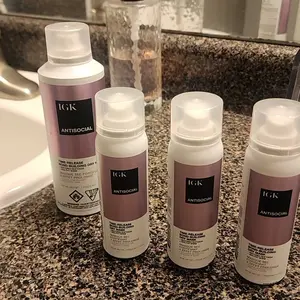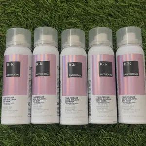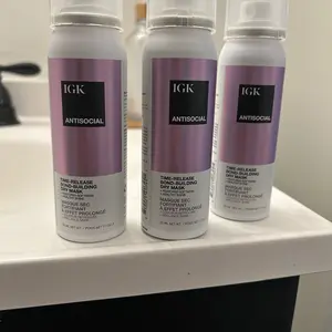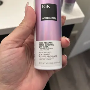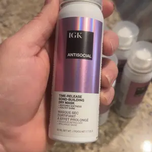 IGK ANTISOCIAL TRAVEL SIZE Bond-Building Dry Hair Mask is a vegan and cruelty-free product. It repairs, strengthens, softens, smooths, and adds shine to damaged hair. It reduces frizz and provides hydration without buildup. This leave-in overnight treatment requires no rinse until morning. Perfect for travel, it is smaller than full-size bottles and TSA-friendly.