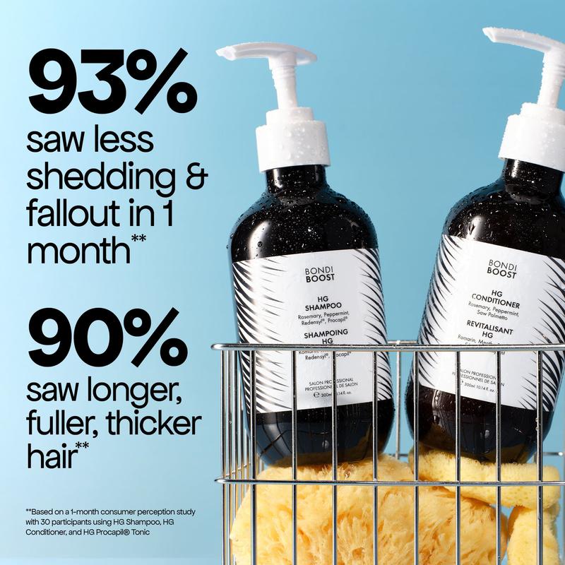 Start here for thicker, fuller, healthier-looking hair and less hair shedding. Discover the power of the HG range with our NEW Lock Drops Scalp Serum and travel-friendly size shampoo & conditioner. This trio—HG Shampoo, HG Conditioner, and HG Lock Drops Daily Scalp Serum—works together to cleanse, nourish, and revitalize your scalp and strands. Formulated with powerful botanicals - like Rosemary, Aloe, Procapil & Redensyl- and essential peptides, each product supports thicker, healthier-looking hair while helping to reduce breakage and boost shine.
