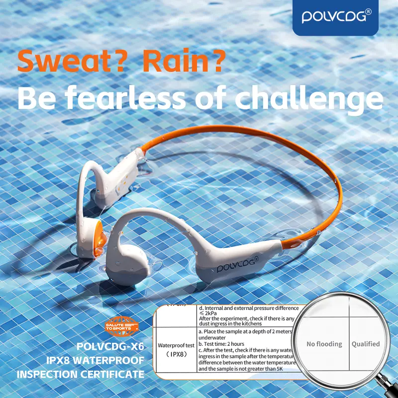 5. POLVCDG X6 wireless bone conduction headphones are deeply waterproof, 10 hours long battery life, 28g lightweight body 32GB large capacity.