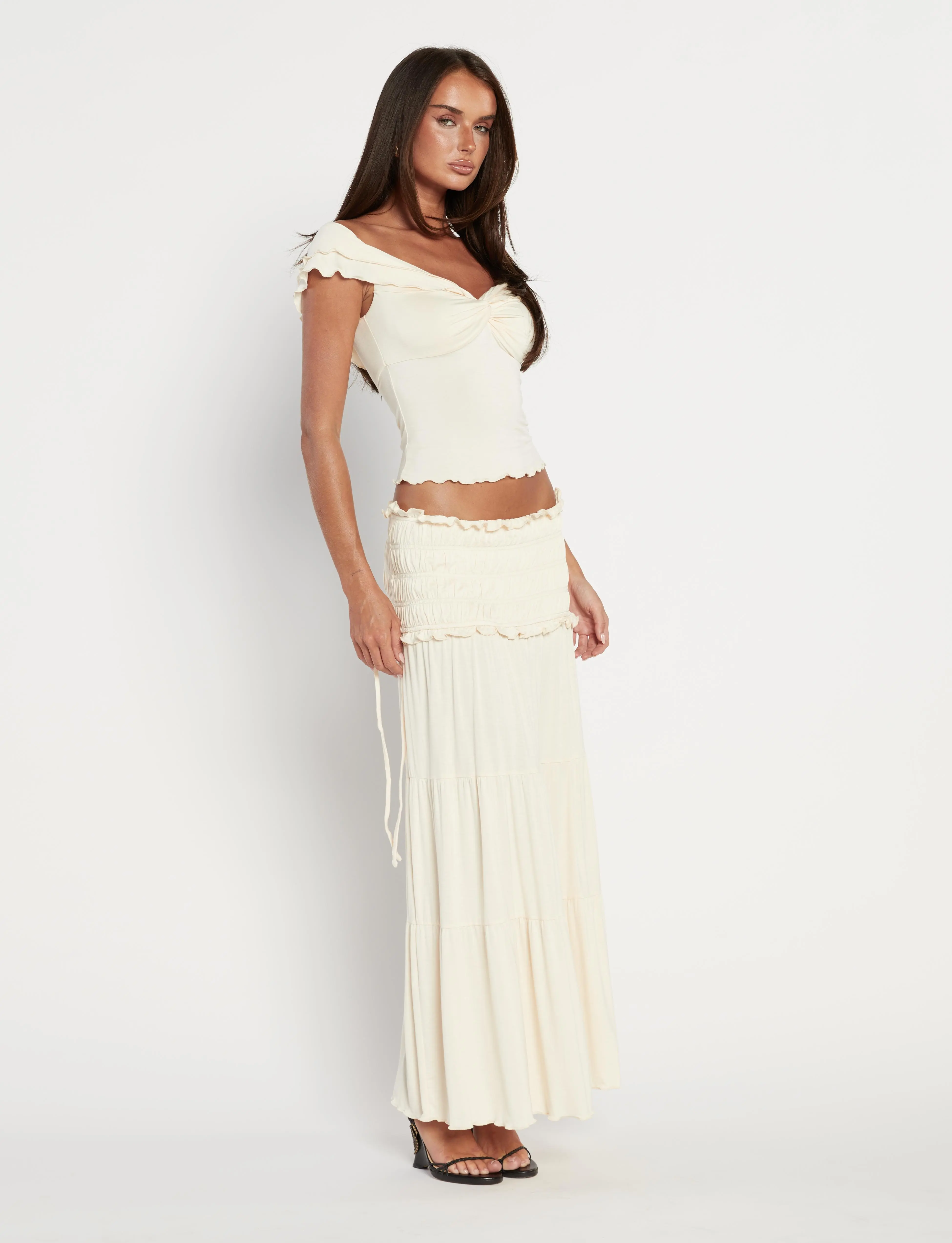 ·Neutral, bone colored off-shoulder style top in a soft buttery jersey fabrication