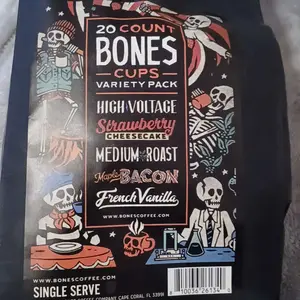 I have never had Bones coffee and am pleasantly surprised at how good it tasted. The bacon coffee was my favorite but I was impressed that the strawberry cheesecake coffee was not overly sweet but just enough sweet. I would buy from again