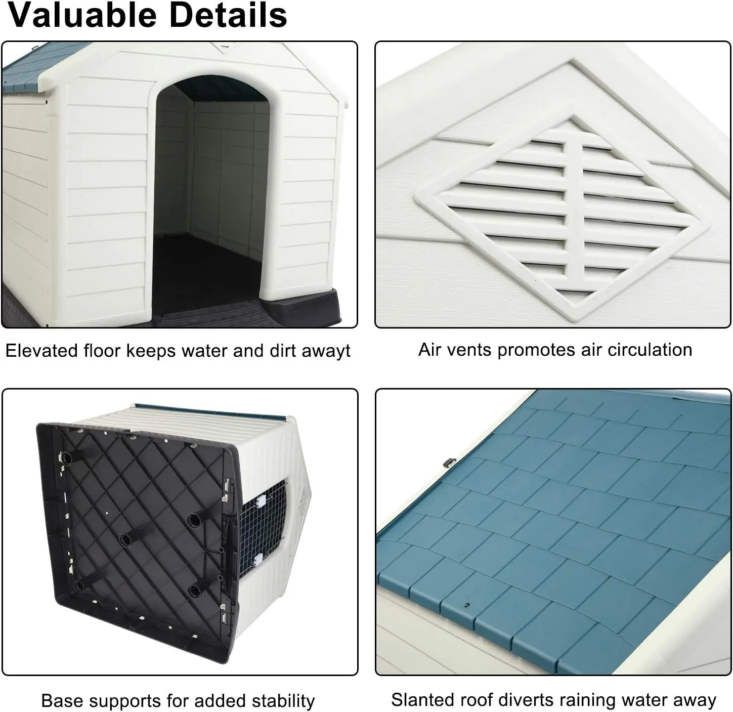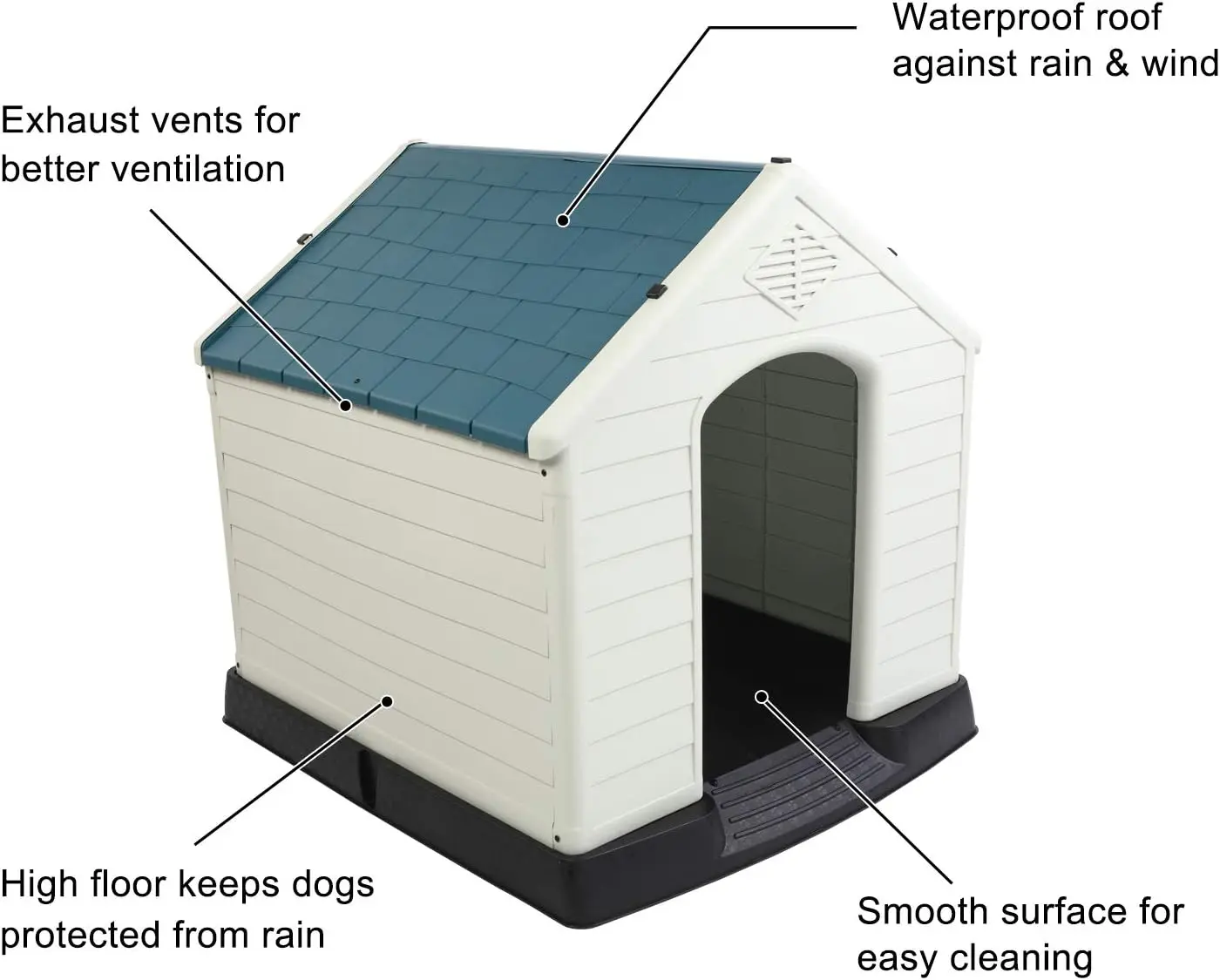 ·【All-Weather Design】- The pet house is a comfortable, personal space to keep your pet safe from all weather elements. This dog home features air ventilation slots guard for fresh air flow. Raised floor can prevent water flowing into the dog house. Slanted roof prevent water ponding to keep pets dry