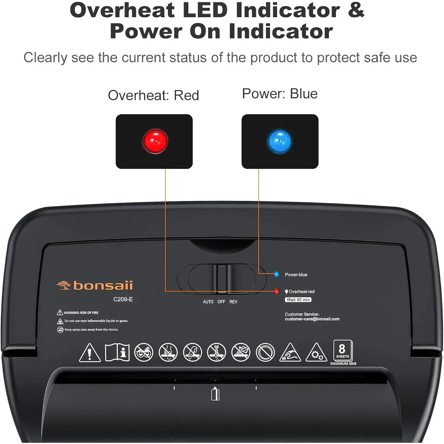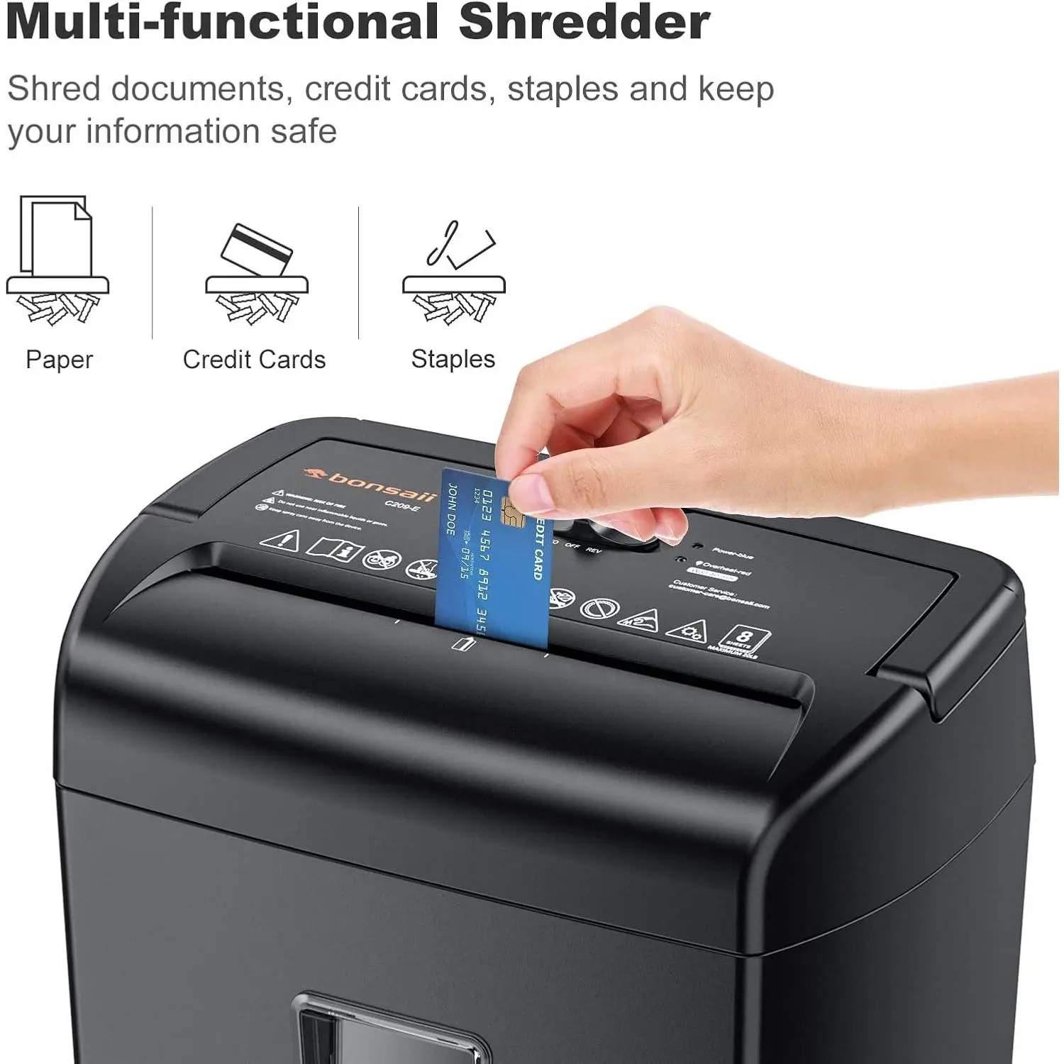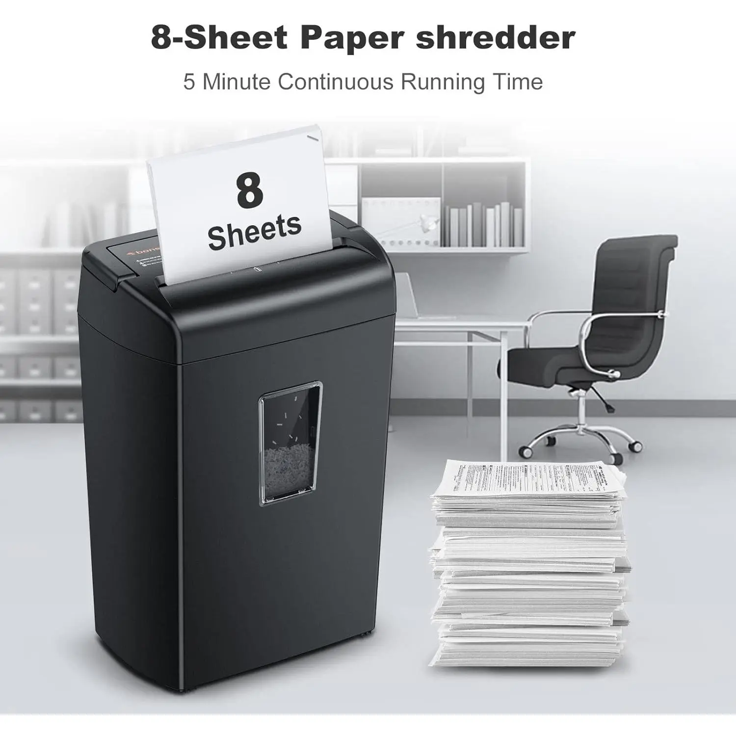 8 Sheets Shredder: Bonsaii C209-E paper shredder 5 minutes continuous run time with 40-minute cool down cycle, Use high performance motors and sharp blades, Shredding 8 sheets of paper at a time, and also shred credit cards, staples and CDs