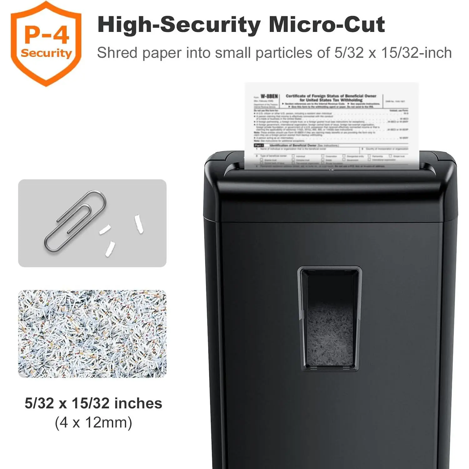 P-4 High Security: Micro-Cut shredder can shred paper into tiny particles of 5/32 x 15/32-Inch (4 x 12 mm), security level P-4, which better protects your personal privacy. This shredder is very suitable for office, small office or home office