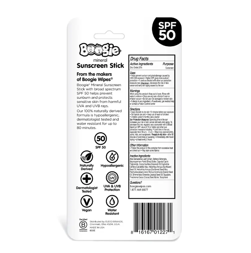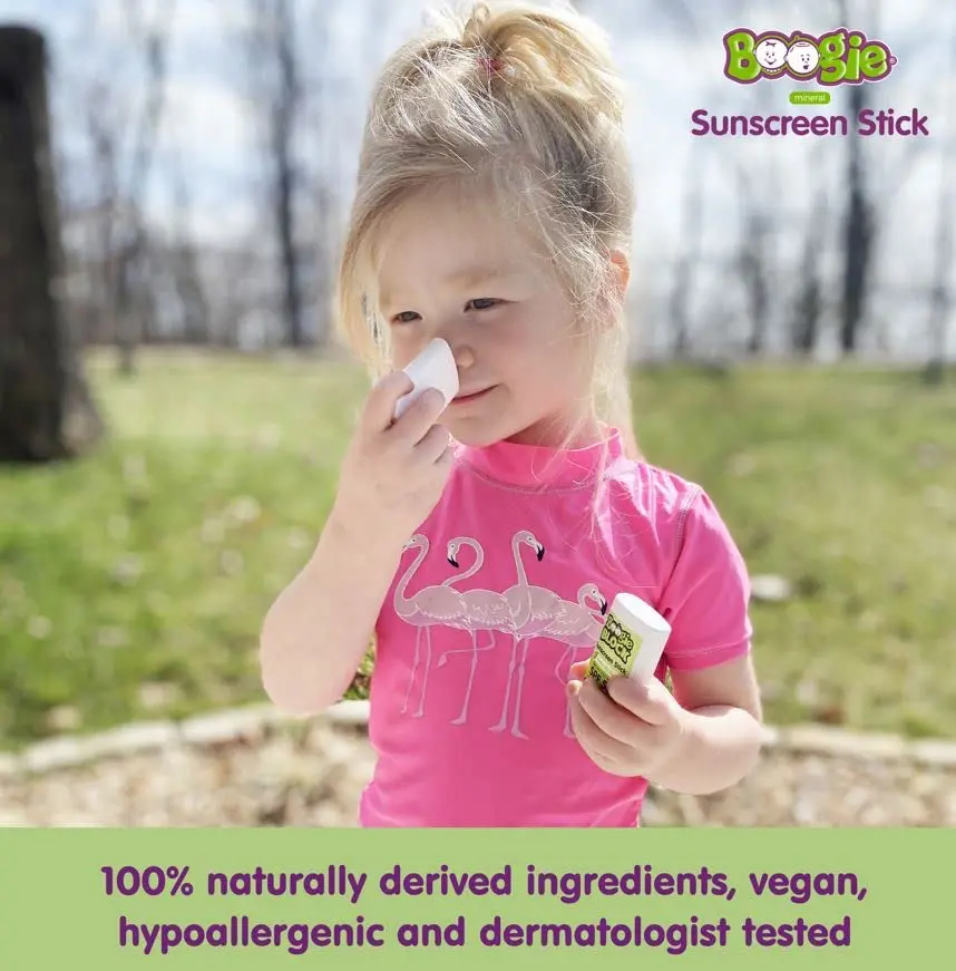 The Boogie Mineral Sunscreen Stick is a gentle, zinc-based sunscreen designed to help protect baby’s sensitive skin during outdoor time. Made with 100% naturally derived ingredients, this easy-to-apply stick provides broad spectrum SPF 50 protection and is formulated to be gentle, hypoallergenic, and dermatologist tested.