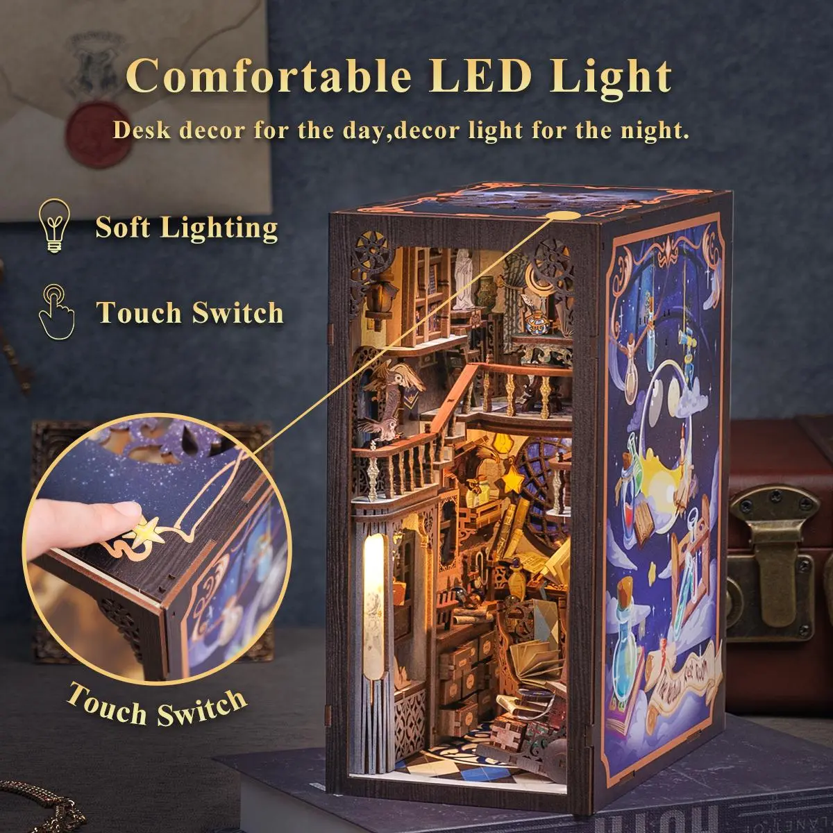 The woods outside the window, the magical star lights, the books on the table and the magic potion bottle, this should be everyone's dream magic studio