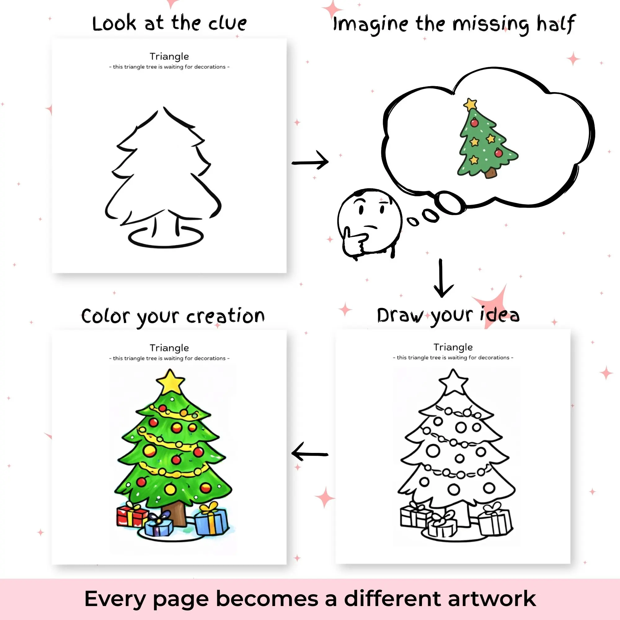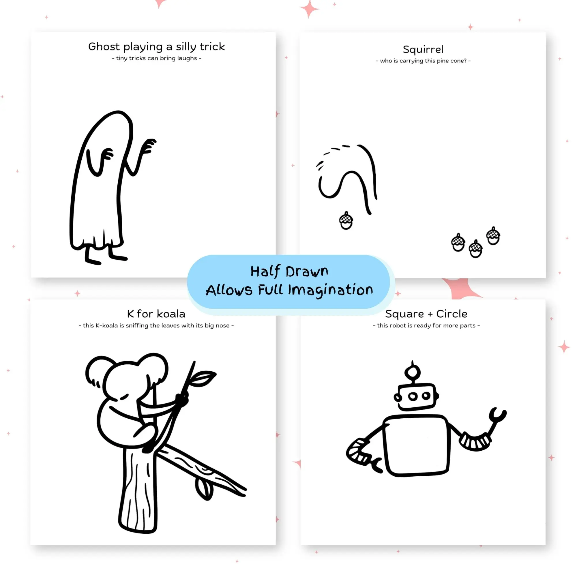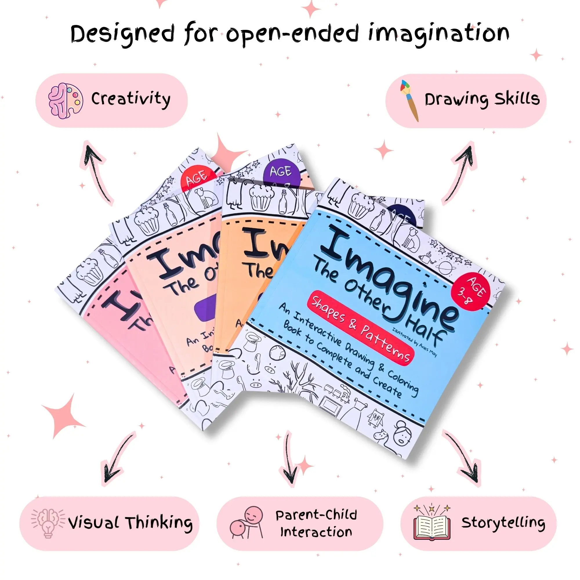 An interactive drawing and coloring book designed for children ages 3–8 that invites kids to finish the picture, invent stories, and create their own worlds. It combines guided prompts, open-ended drawing, and bold outlines to turn simple pages into imagination-driven learning experiences.