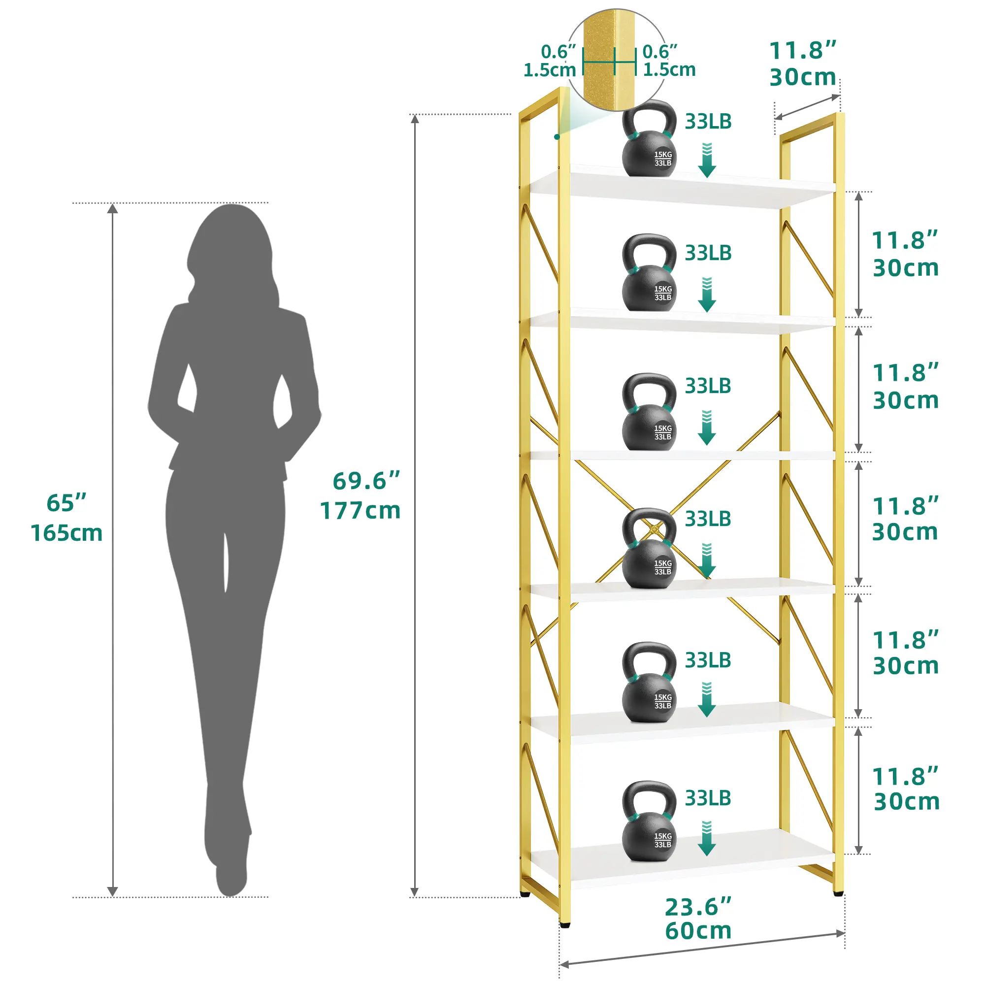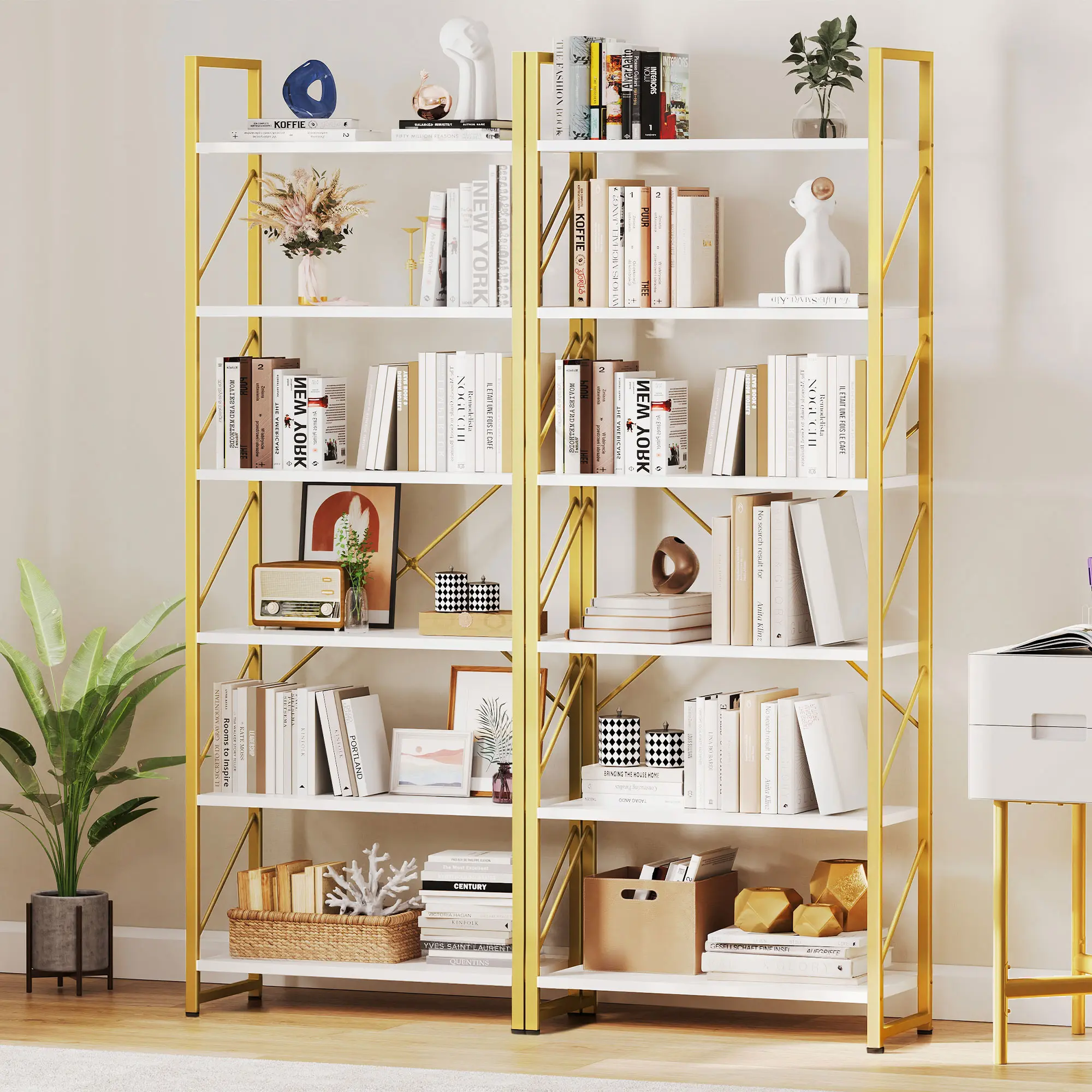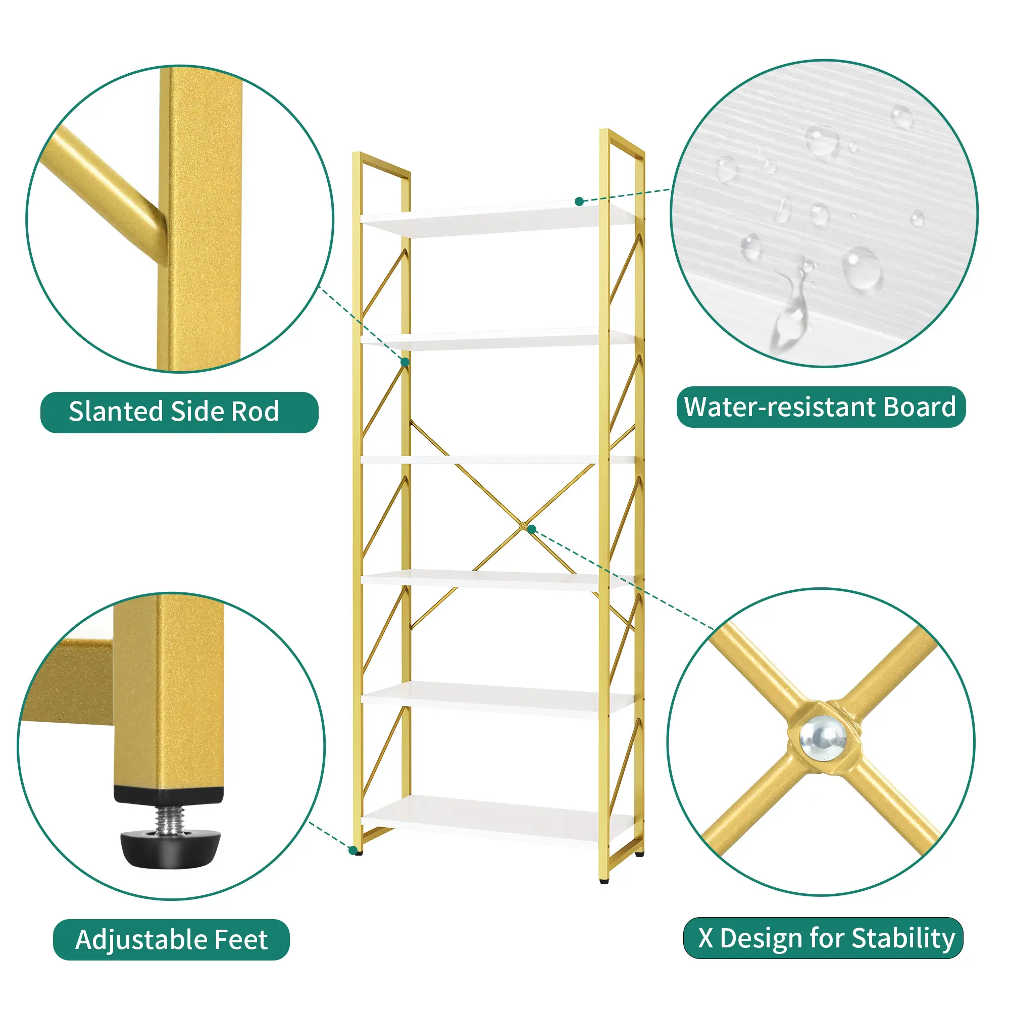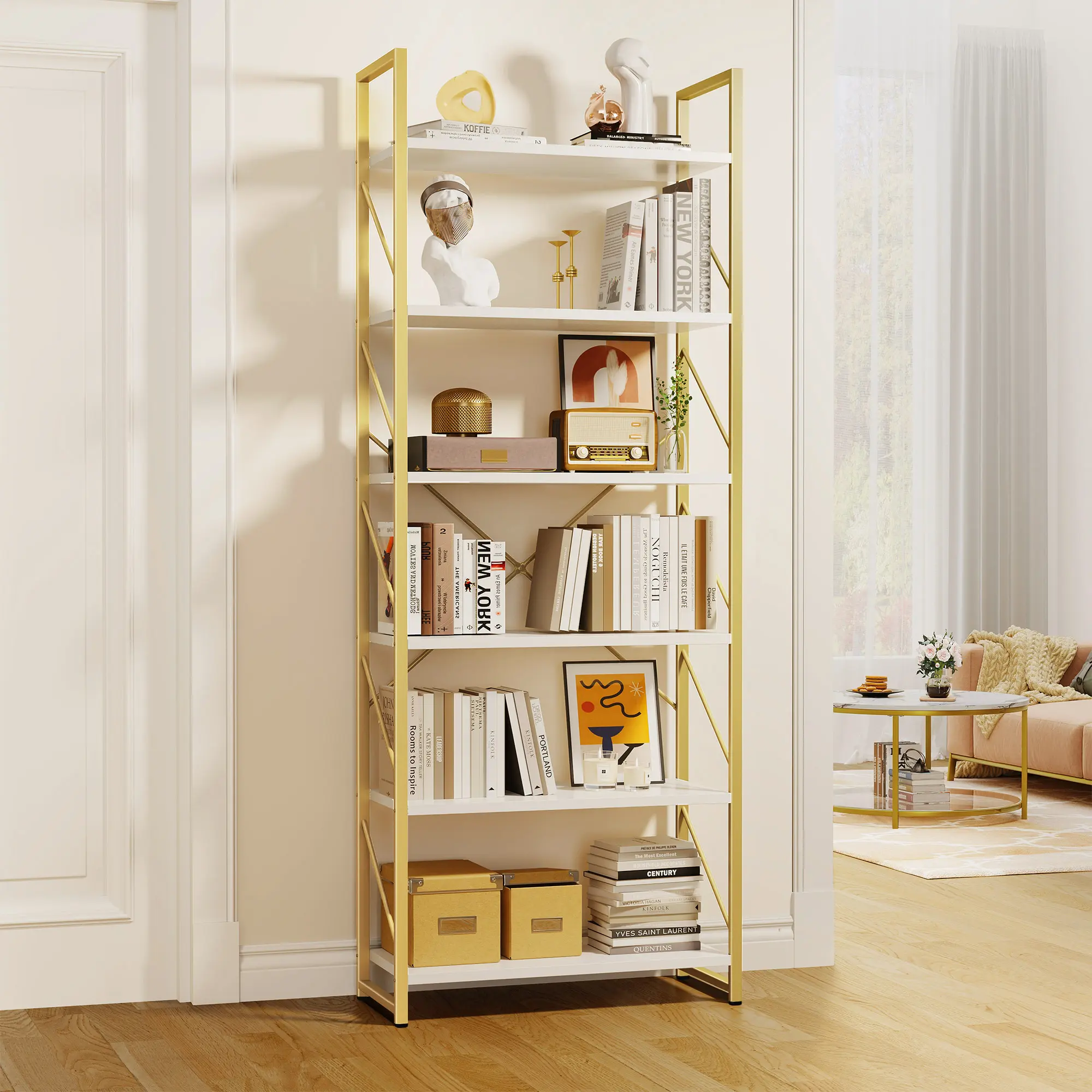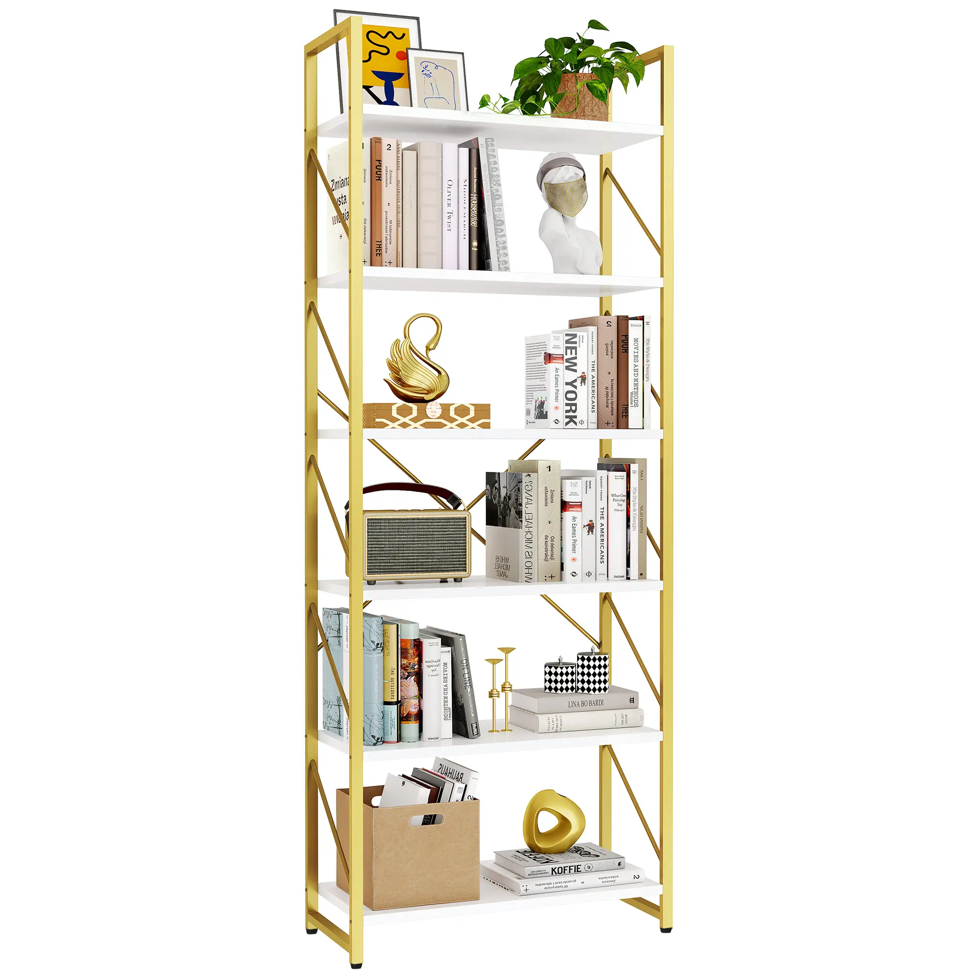 Durable & sturdy: Crafted from power-coated wrought iron frame and sturdy boards, the metal bookshelf features high durability and stability. The gold metal side bars and X-shaped rods in the back improve stability and add a focal point to your room