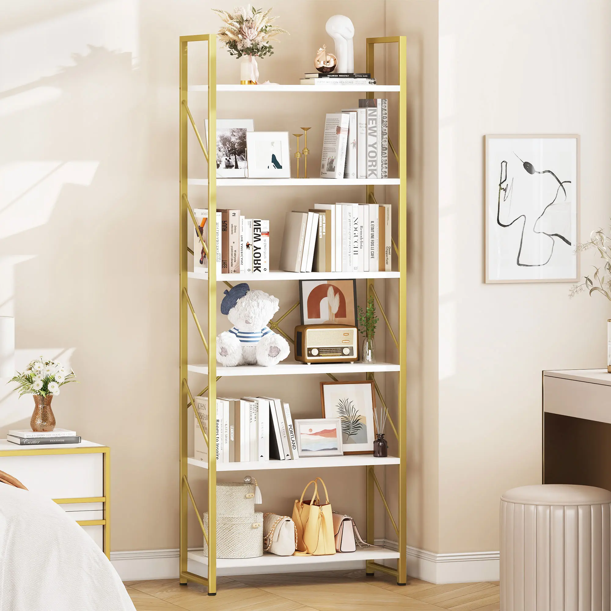 Artsy modern design: Especially designed with a golden frame, this chic bookcase blends well streamlined minimalism and modern style. Its luxurious yet elegant look and simple structure make it a fashionable and functional fit in any room