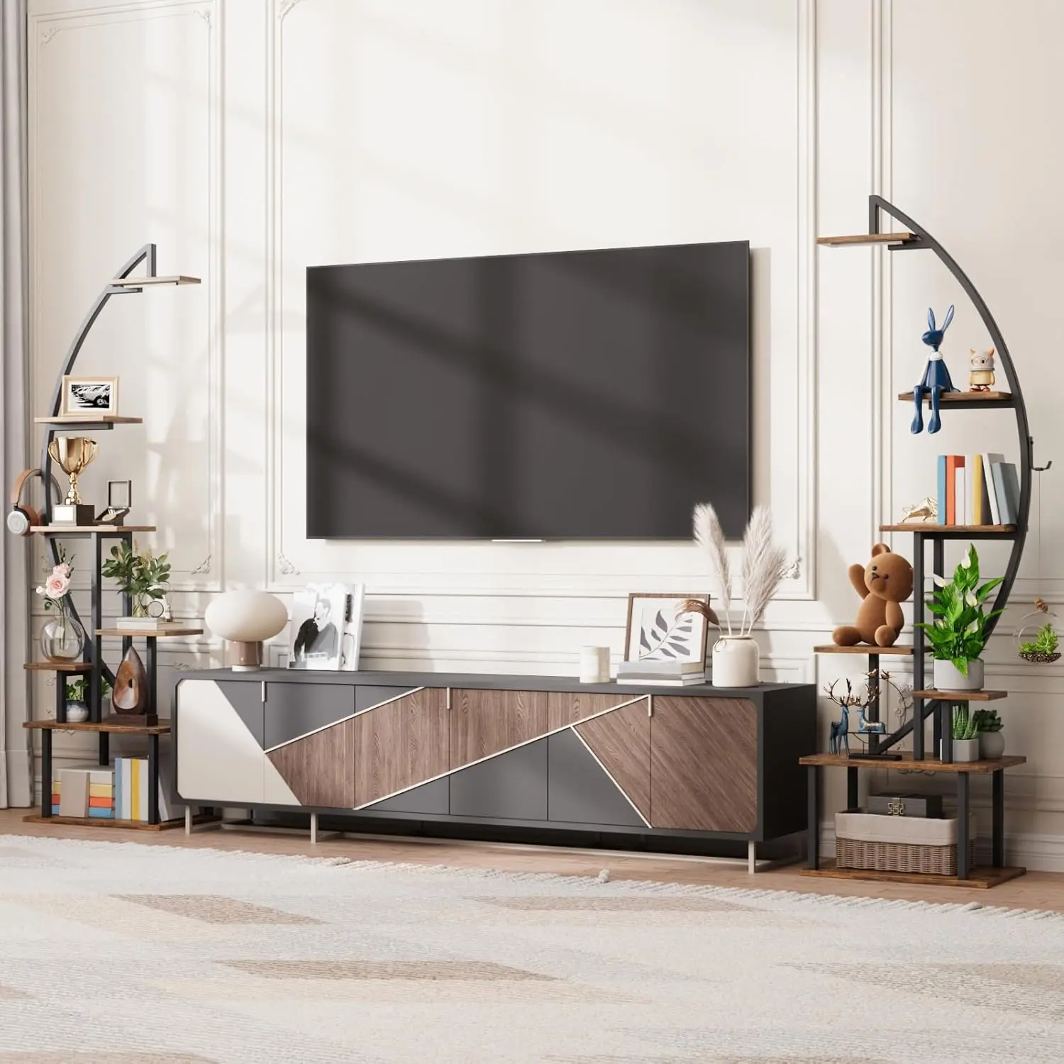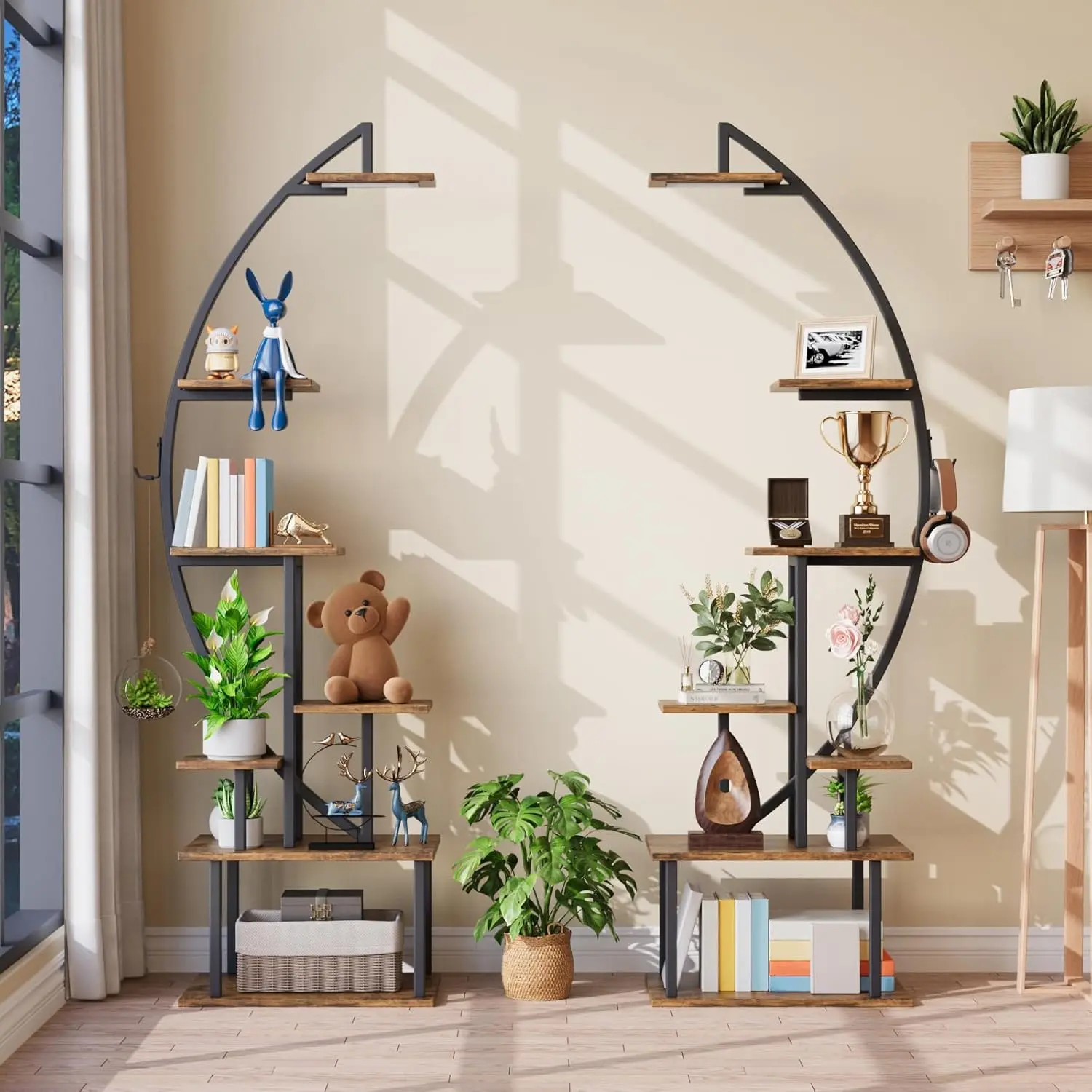 ·Enhance your living space with this elegant tall bookshelf, designed to provide both functionality and style. This set includes two arched bookshelves, each featuring 7 tiers, 14 display positions, and 2 hangers, offering ample storage for a variety of items such as books, plants, collectibles, and ornaments.