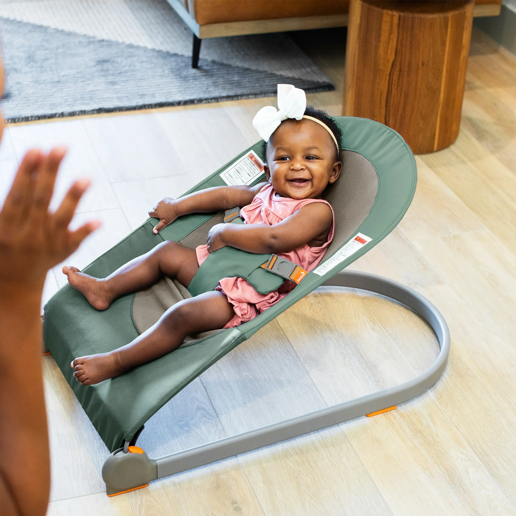 Our easy-to-use design sets up fast, letting you quickly give baby a cozy seat with just the right amount of natural spring. You choose the angle that’s best for your baby. The lower angle is perfect for a younger baby and provides a bit more head support. As they grow, adjust to the higher angle and let them sit in style with a view of the room in front of them. At either angle, the breathable mesh and twill fabric helps keep them comfy while the secure 3-point harness keeps them in place. Babies tend to leak, so this fabric slips off easily for a quick clean in the machine. And when it's time to stash this baby bouncer away, SLANT folds flat and includes a tote bag that makes storage or taking it along on the go simple.