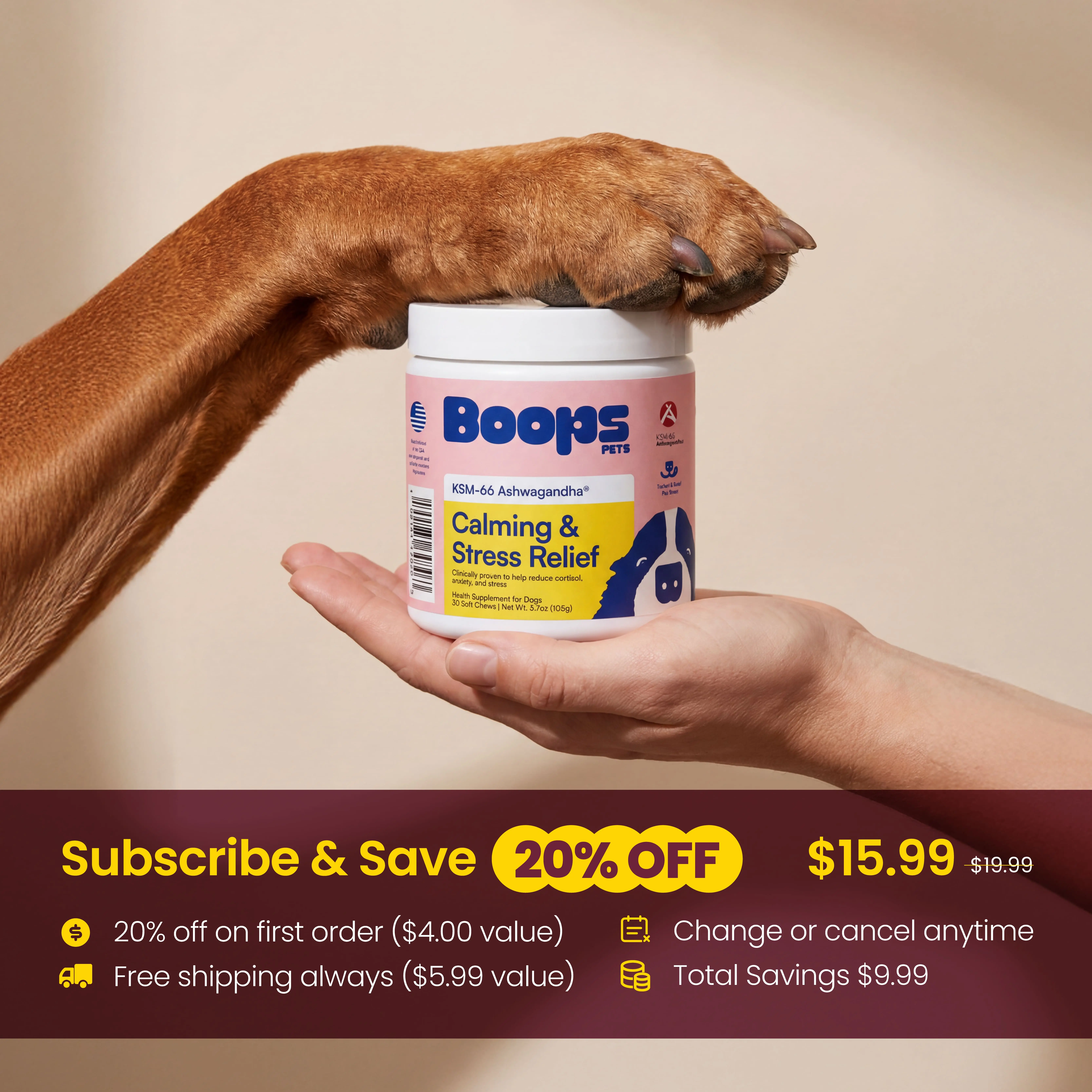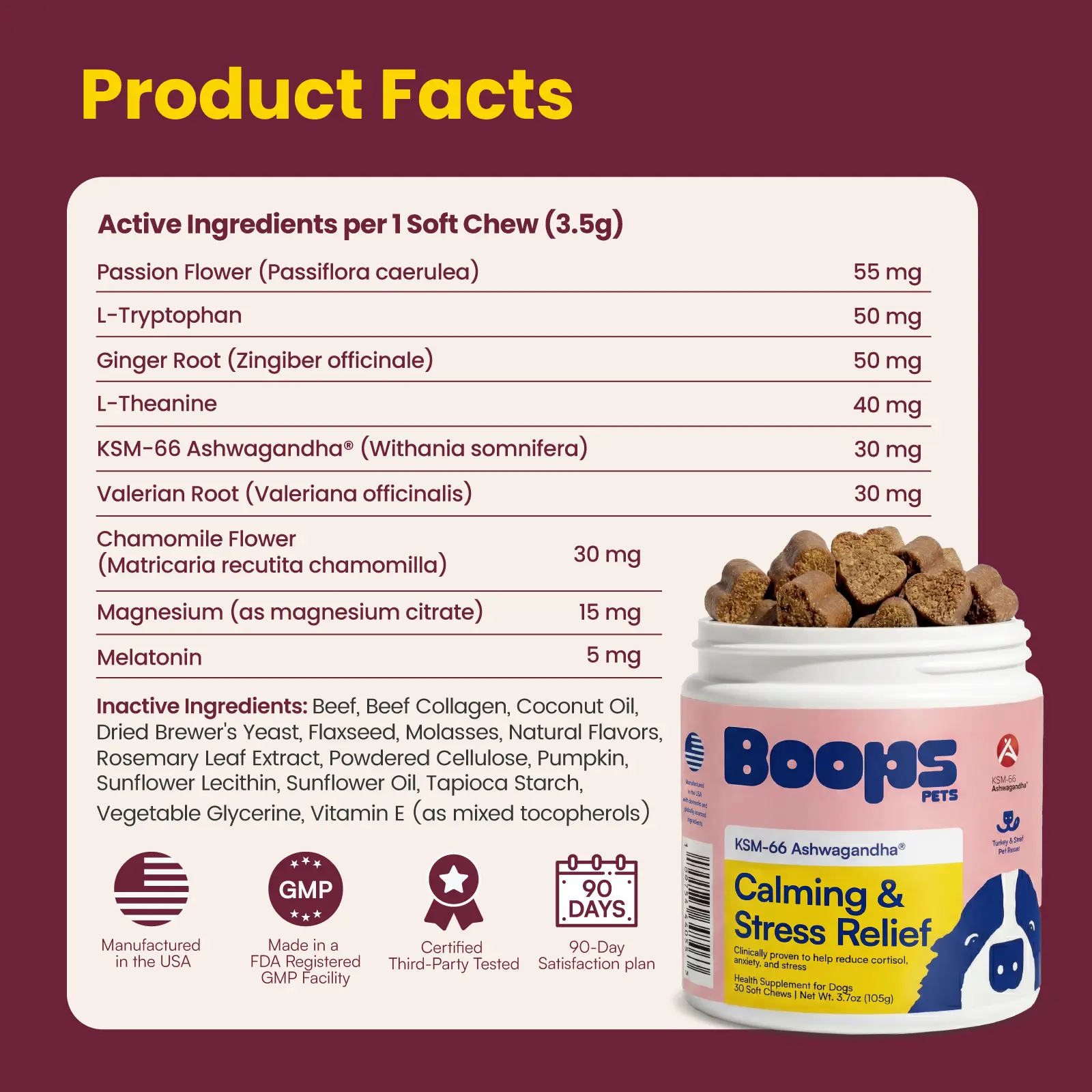 I have a very energetic beagle mix with an Australian cattle dog who is four years old. We typically get her energy out by running everyday. However, she does not like going in the car and has a tough time calming down. I tried this boops product and I absolutely loved it, she was so calm and happy.