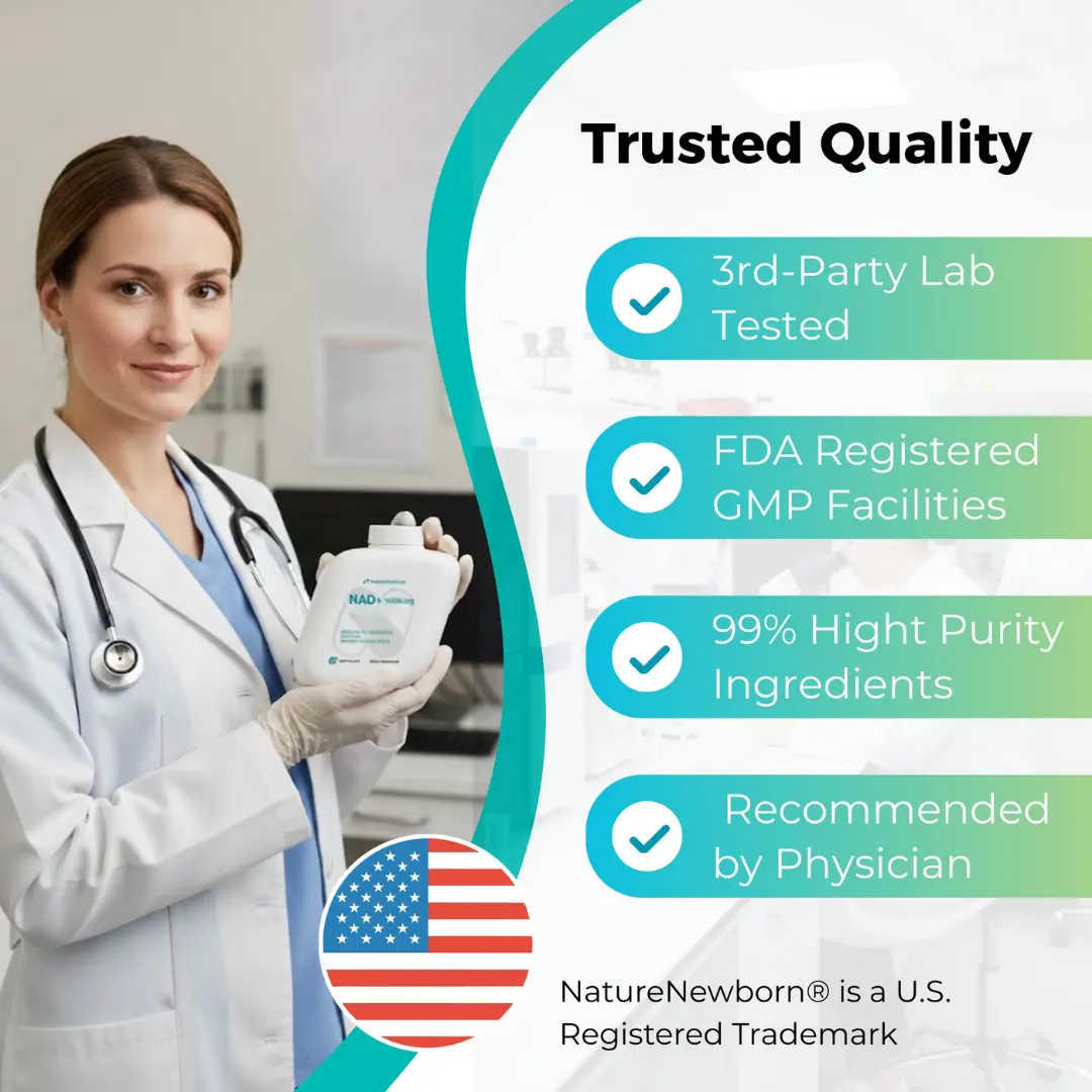 Our NAD+ Booster is rigorously tested by third parties for purity and potency. This ensures transparency and reliability. A certificate is available upon request. Discover the science behind NAD+ and unlock its full potential for a healthier life.
