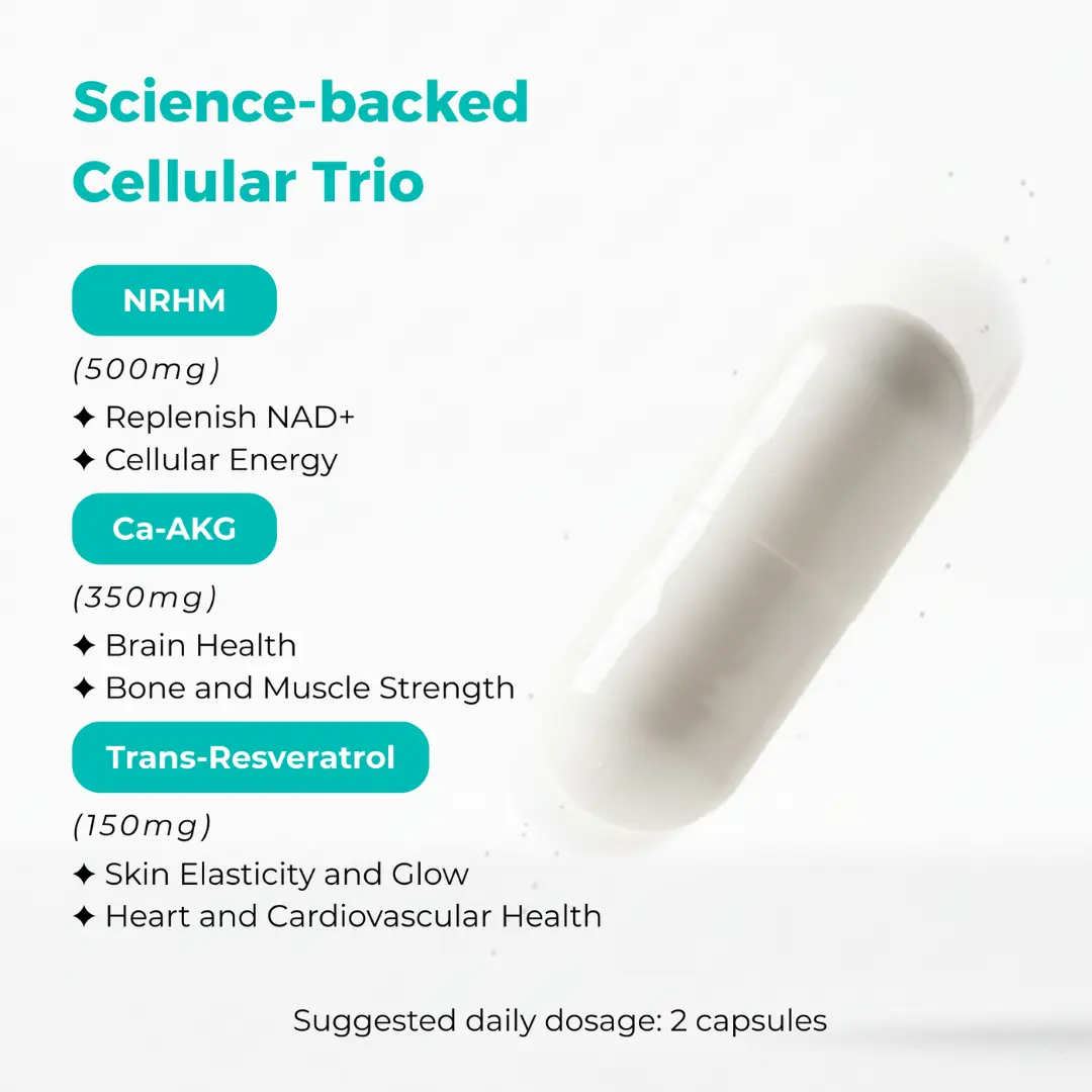 Maximize anti-aging with Nicotinamide Riboside, Calcium Alpha Ketoglutarate, and Trans-Resveratrol. These ingredients work together to support your body's natural processes, promoting optimal health and organ function.