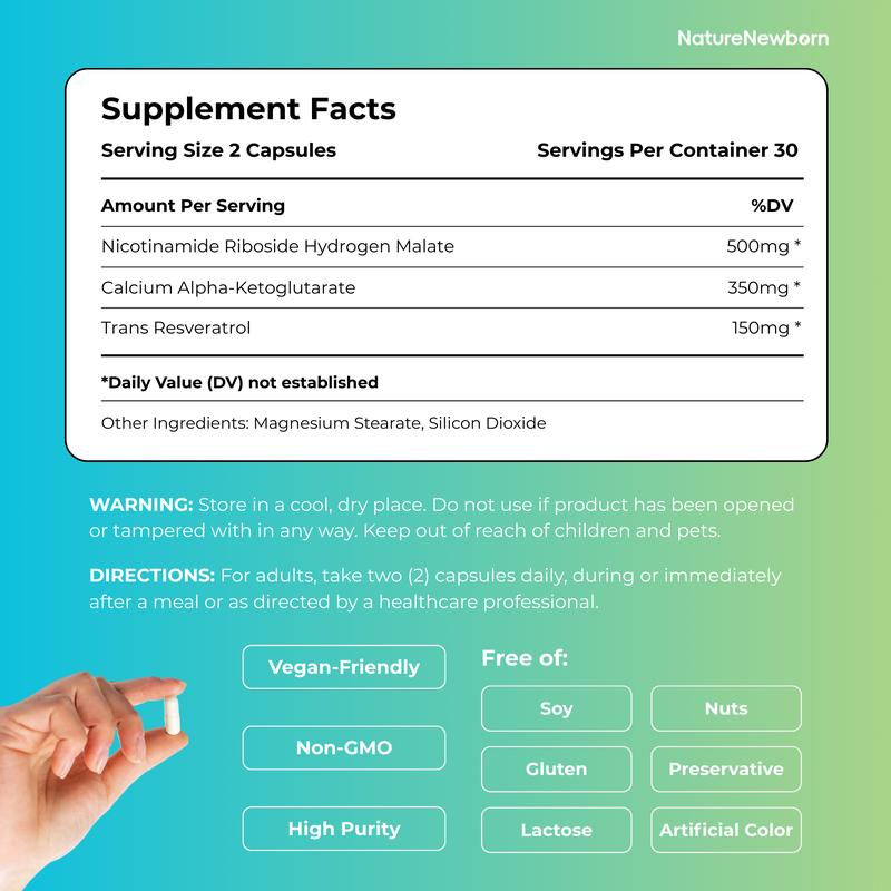 Take two capsules daily, anytime. Each serving contains 500 mg of Nicotinamide Riboside Hydrogen Malate, 350 mg of Calcium Alpha Ketoglutarate, and 150 mg of Trans-Resveratrol. Shop now at Naturenewborn, California, USA.