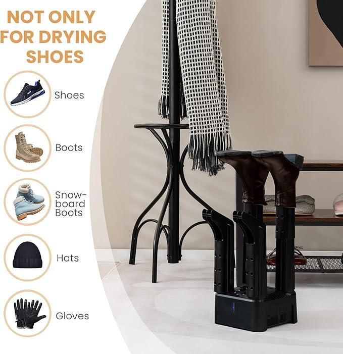 ·️[Fast yet Quiet Drying] With a 200W powerful drying system, this boot dryer can quickly dry wet shoes in 1 hour or washed boot in 2 hours to effectively remove odor and sweat in the shoes. Besides, each pipe features multiple air outlet holes, which is good for drying all parts of the shoes. And the quiet operation avoids disturbing others.