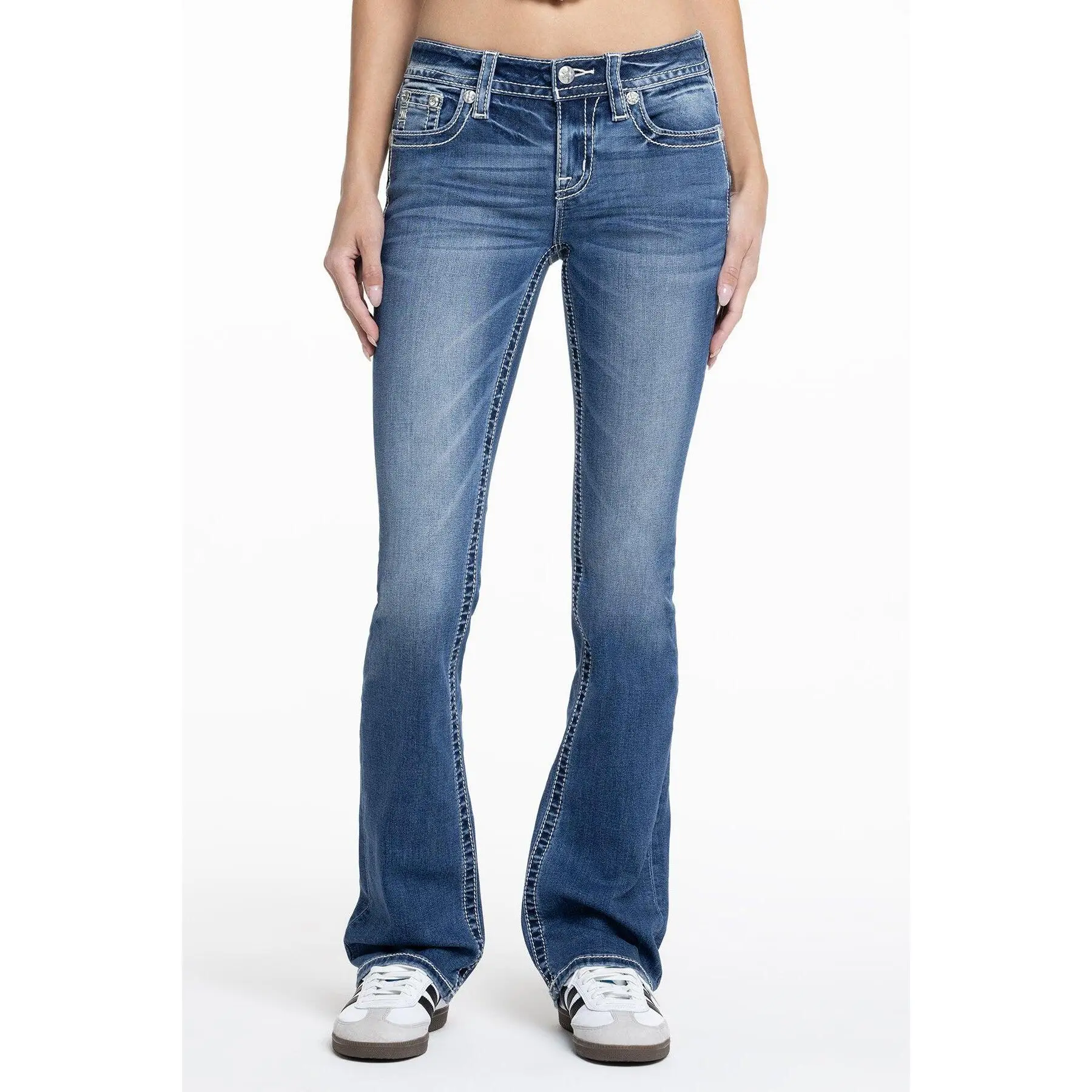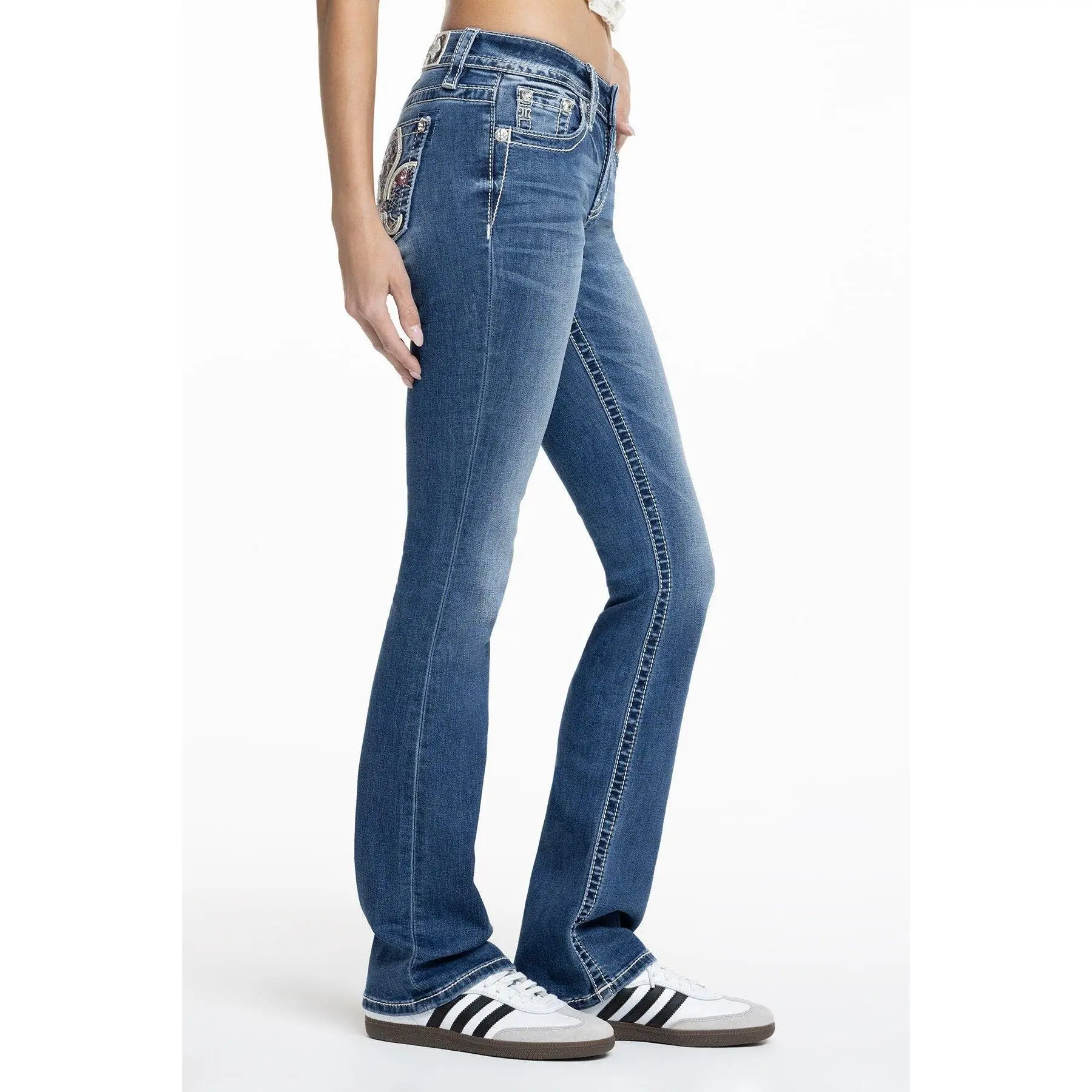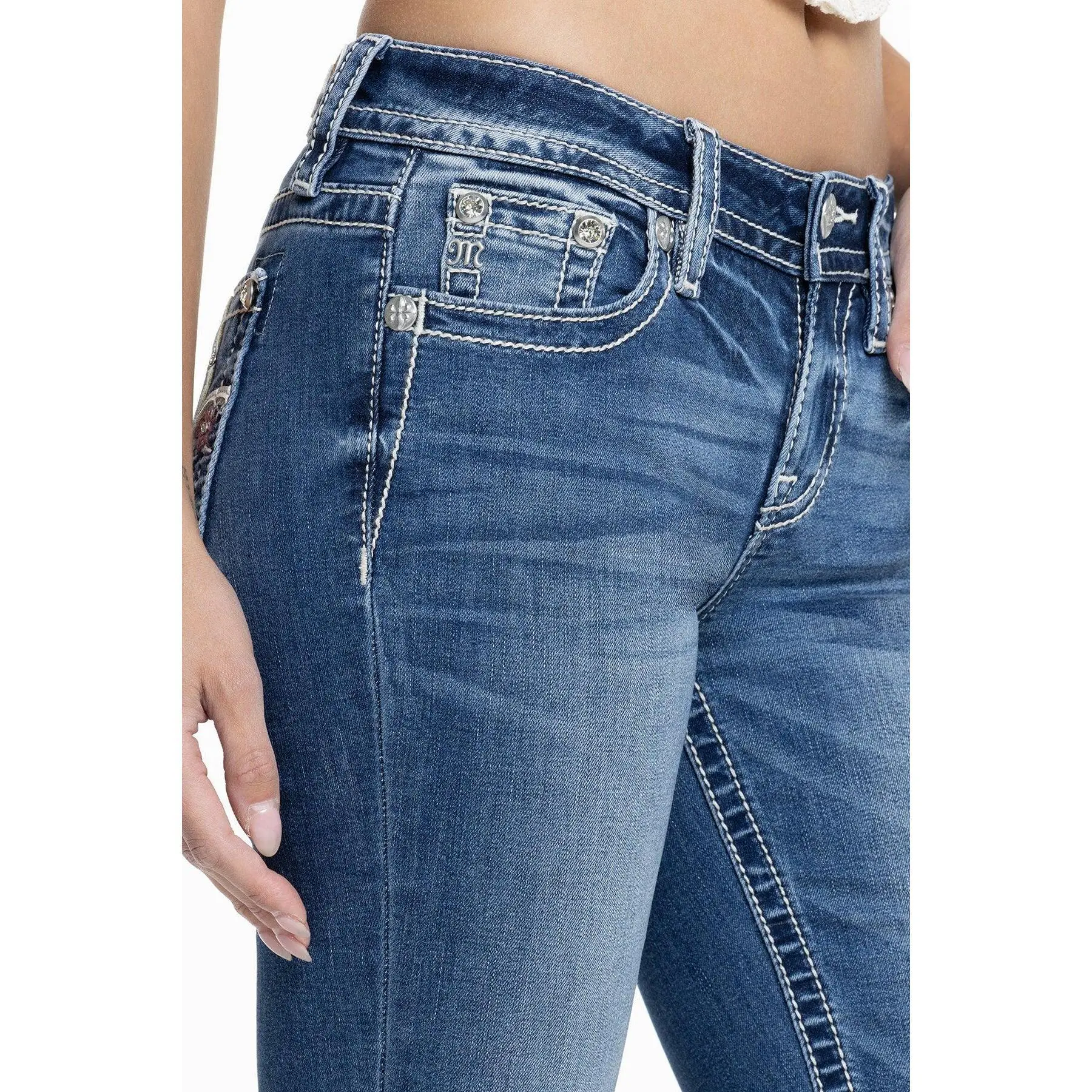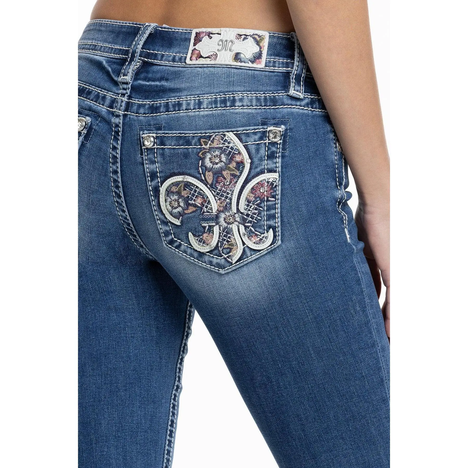 Washed, mid-rise bootcut jeans - Embroidered floral fleur de lis design with leather appliqué borders - Embedded sequins with rhinestone rivet accents - Embossed white leather cross Miss Me brand patch with matching embroidery - Whiskering details - 5-pocket design Model is wearing size: 25 Model Measurements: Height: 5'9" Bust: 34" Waist: 25" Hips: 37" Fabric Content: 66% Cotton, 14% Lyocell, 18% Viscose, 2% Elastane Care: Gentle machine wash inside-out with like colors in cold water. Tumble dry low. Style No. M9436BL-M990, M9436BV-M990