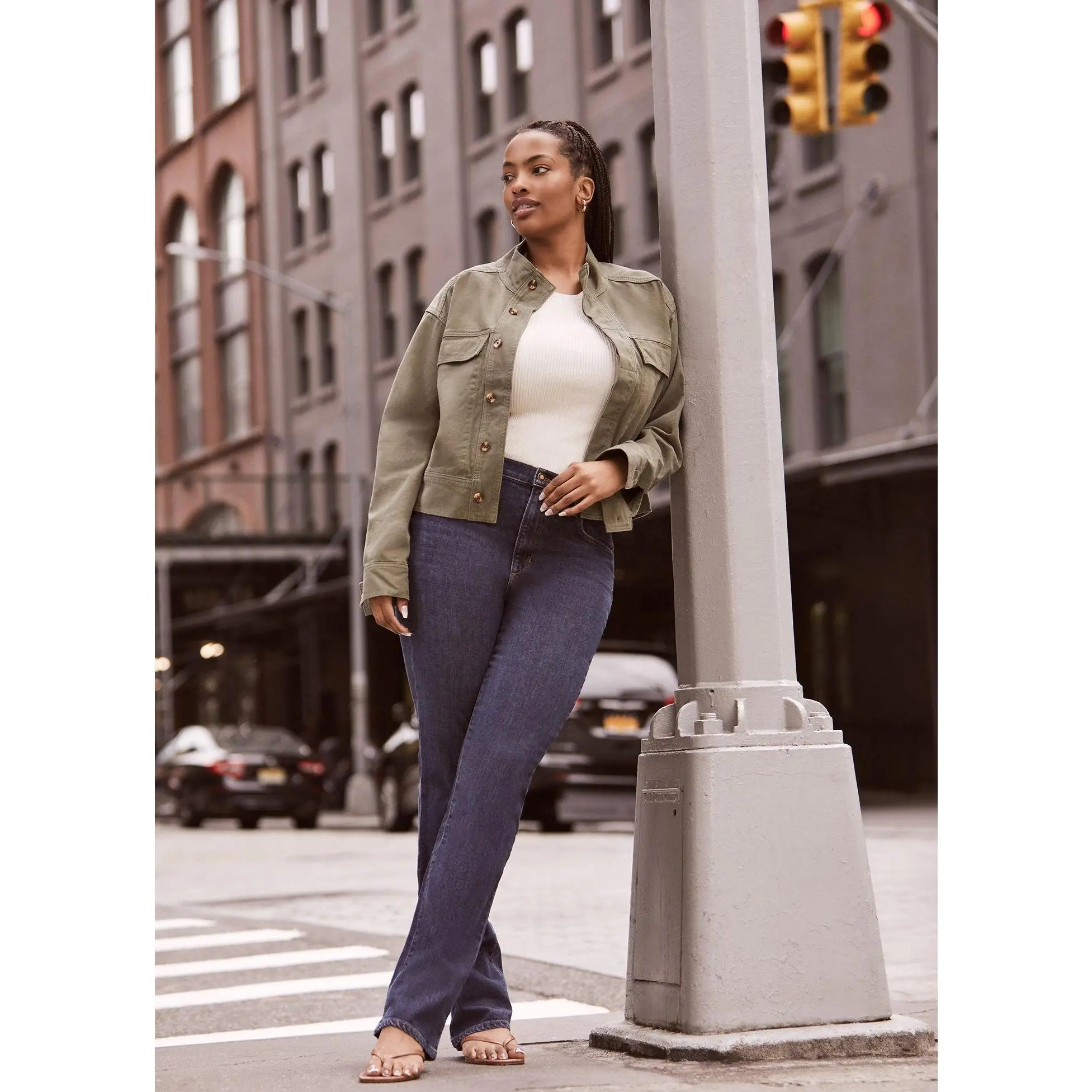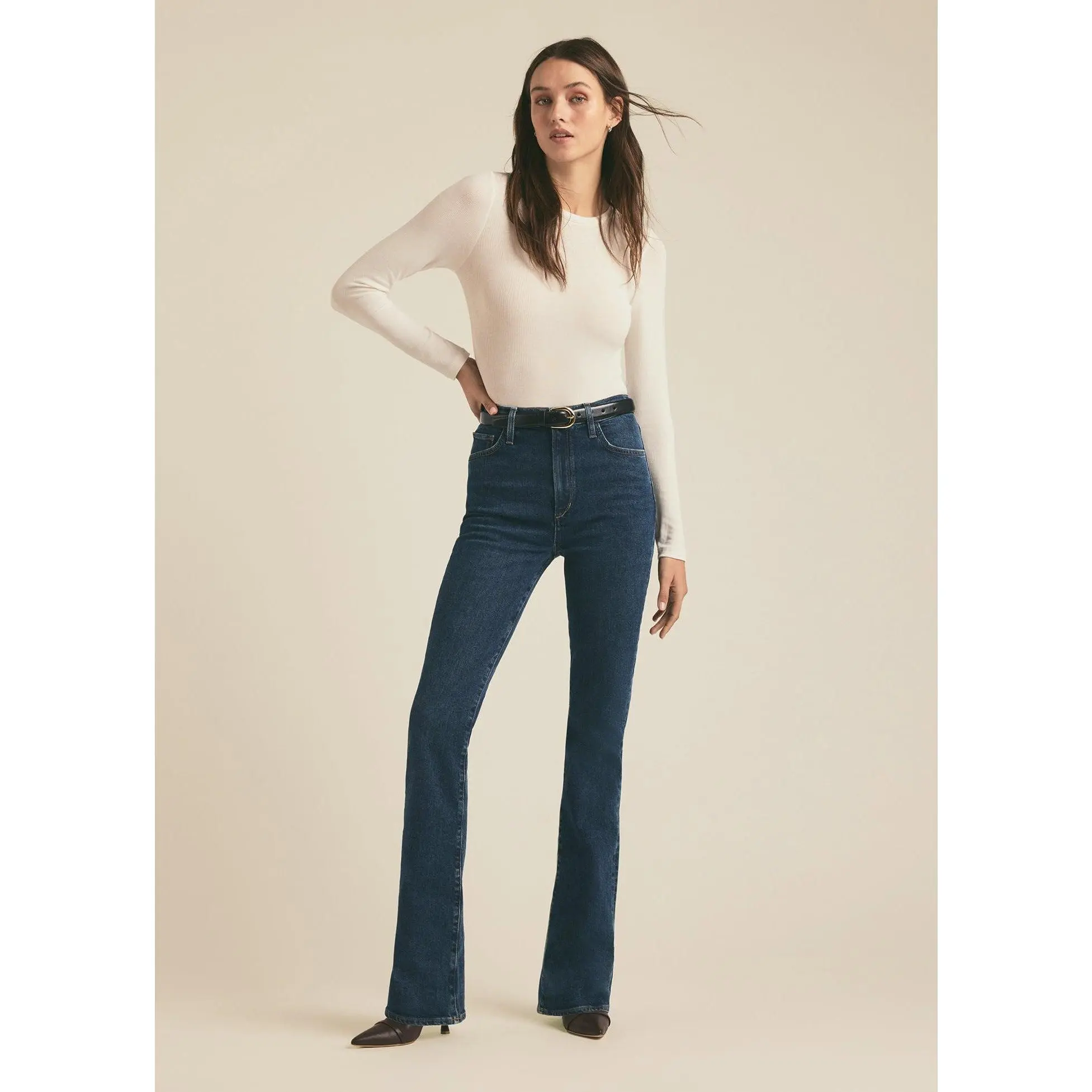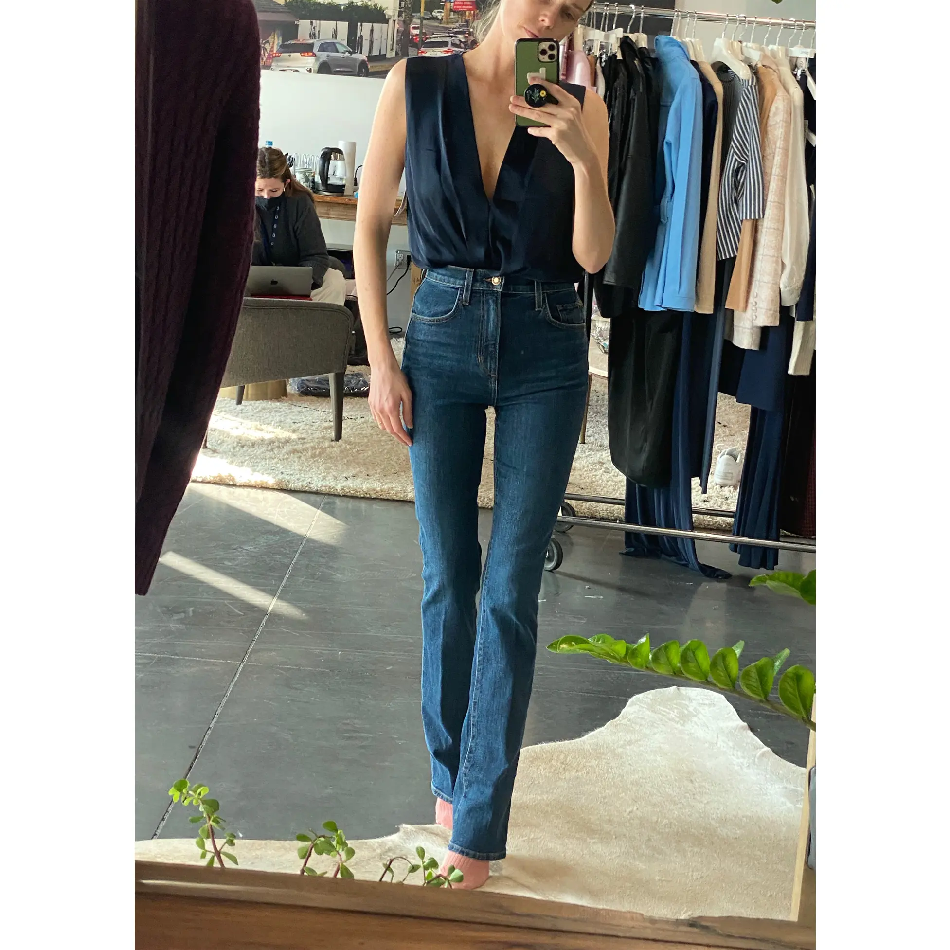 A high five for the super high rise 11.5" bootcut jeans. The retro-inspired style of Woodside gives the Valentina a slimming, rich, dark blue indigo and the stretch gives this denim a well-fitted silhouette. (Gentle fading and whiskering plus Favorite Daughter embroidery on the back waistband, of course.)